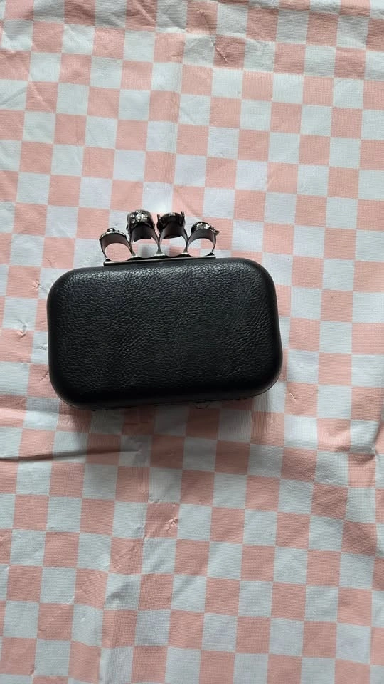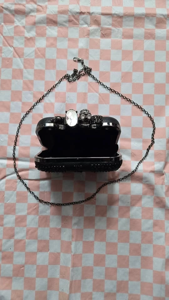 Black Union Jack clutch with a jewelled skull ring handle. Features a detachable chain for shoulder or crossbody wear. Chain is 47" long. Clutch dimensions: 6.5" wide, 4" tall, 2" deep. Opens to 3 inches. Pick up at Queen and John.