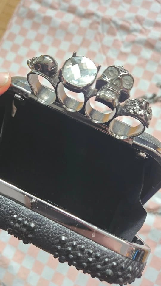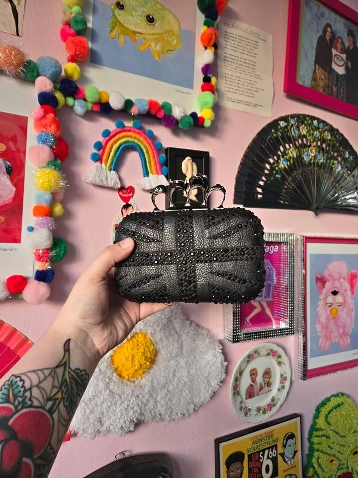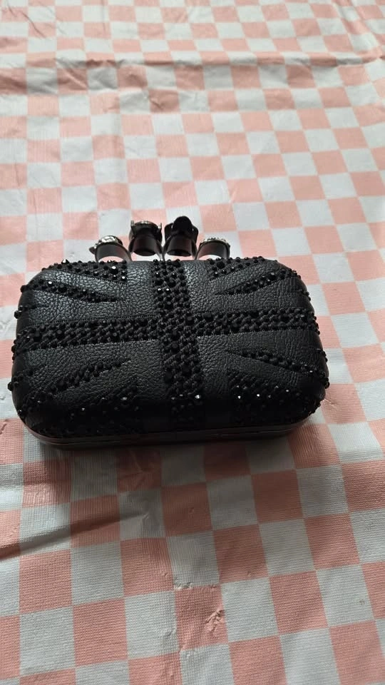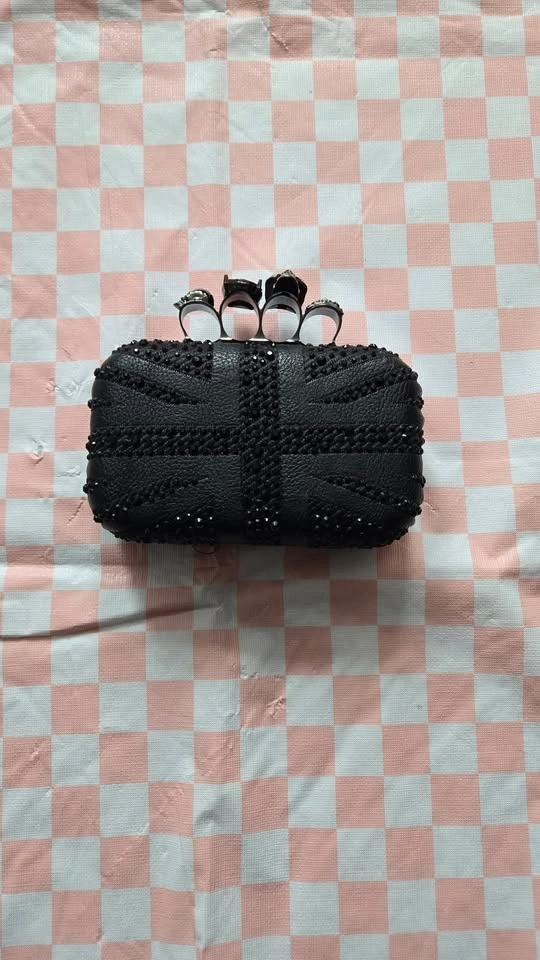 Black Union Jack clutch with a jewelled skull ring handle. Features a detachable chain for shoulder or crossbody wear. Chain is 47" long. Clutch dimensions: 6.5" wide, 4" tall, 2" deep. Opens to 3 inches. Pick up at Queen and John.
