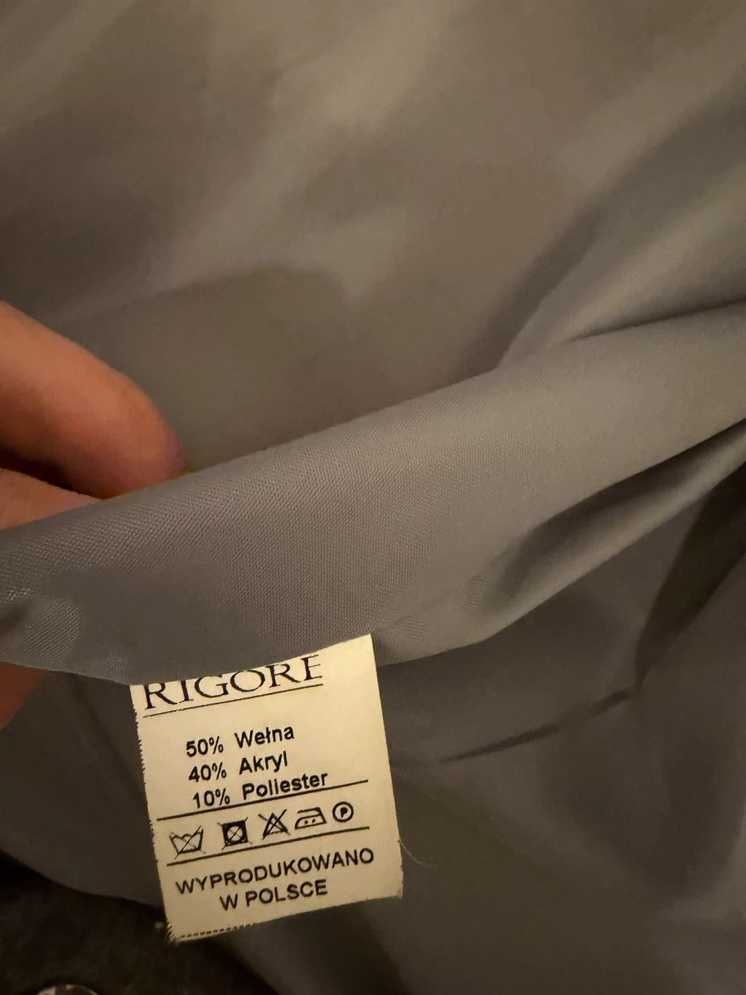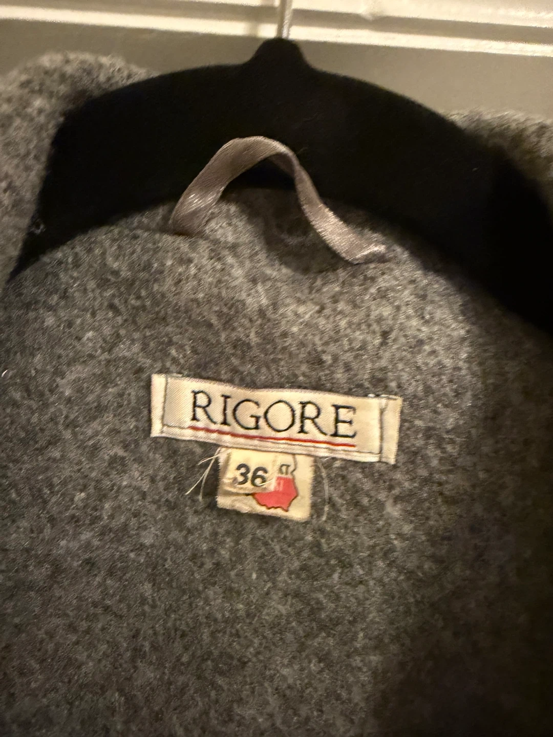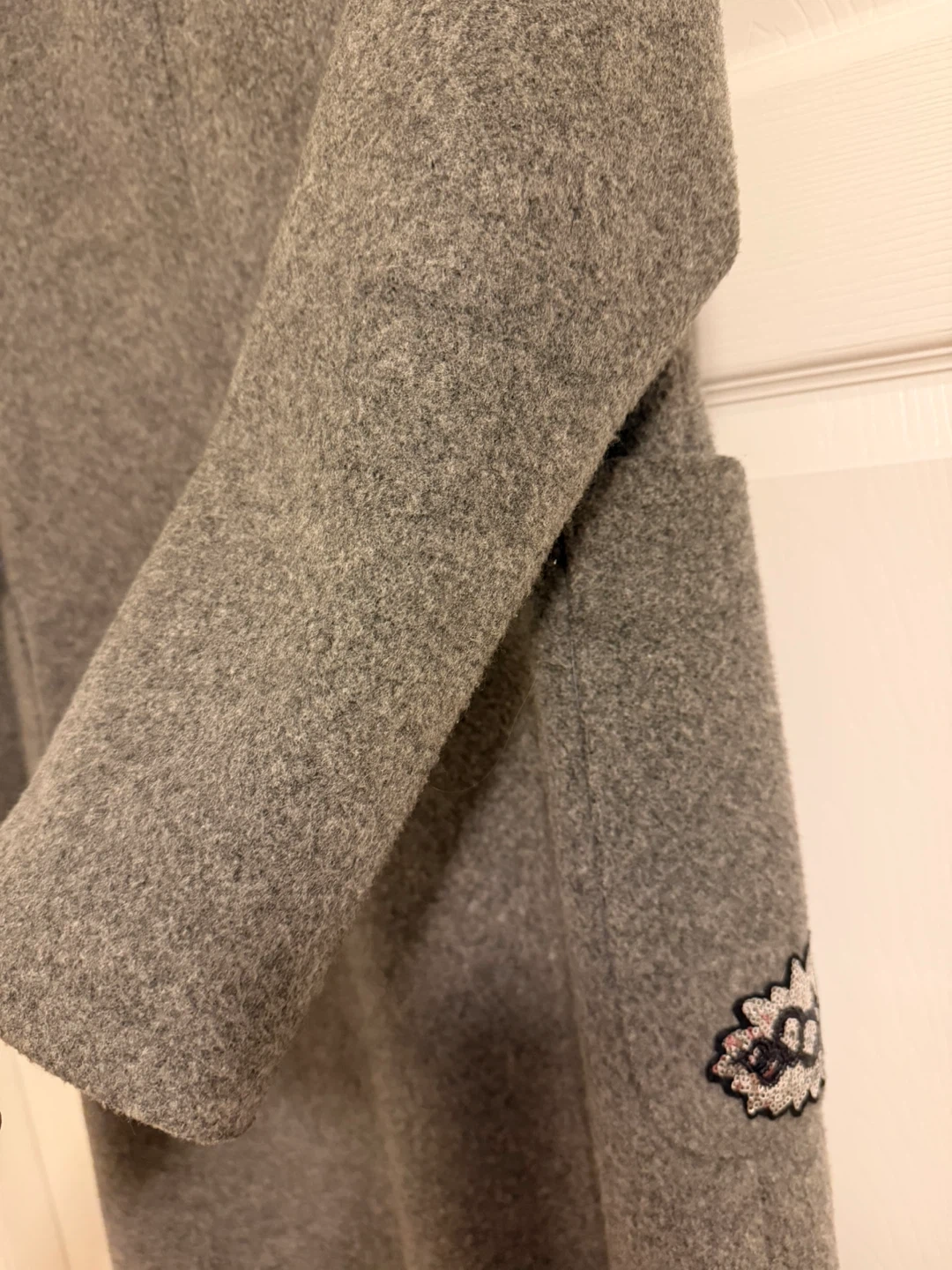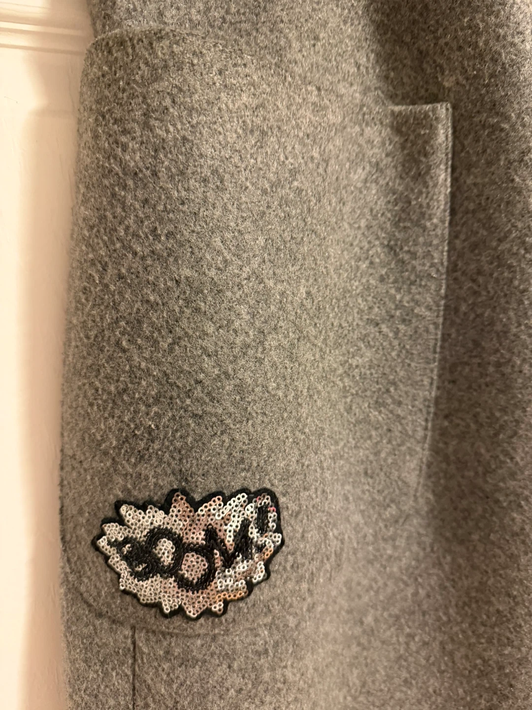 This RIGORE coat is made from a grey wool blend. It features a sequin "BOOM" patch on one side pocket and a matching patch on the sleeve. It's a stylish outerwear piece for cooler weather!