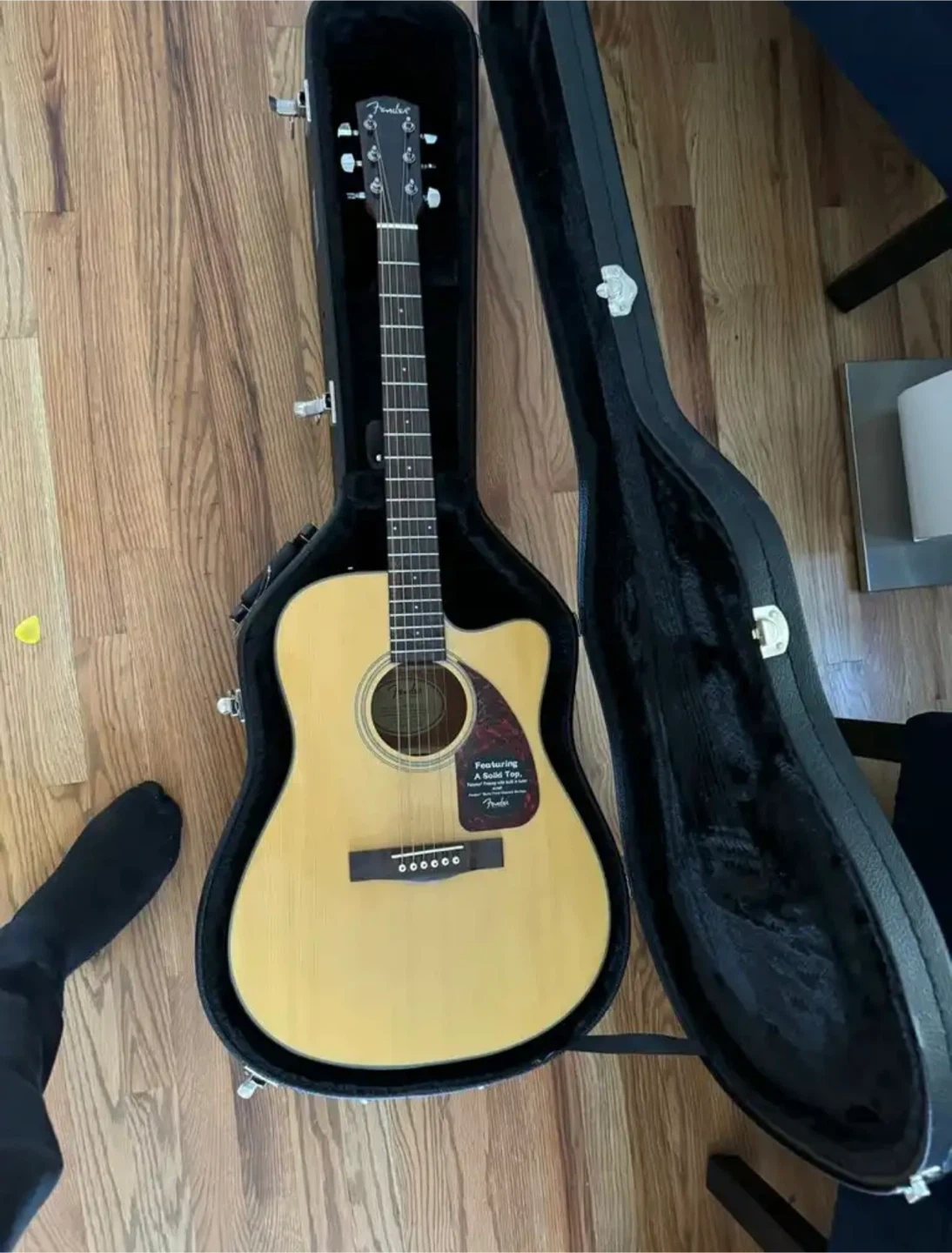 Fender acoustic guitar featuring a solid top. Includes a hardshell case for protection. It's a great instrument for any musician!