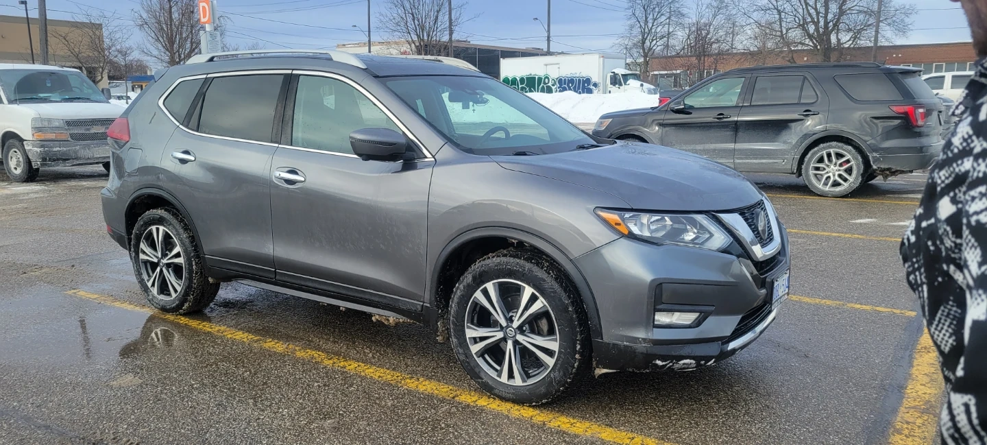 Grey 2019 Nissan Rogue SV AWD SUV 145000km. with navigation. Has a 2.5L 4-cylinder engine and CVT transmission. Features include a backup camera, heated seats, and push-button start.full extra