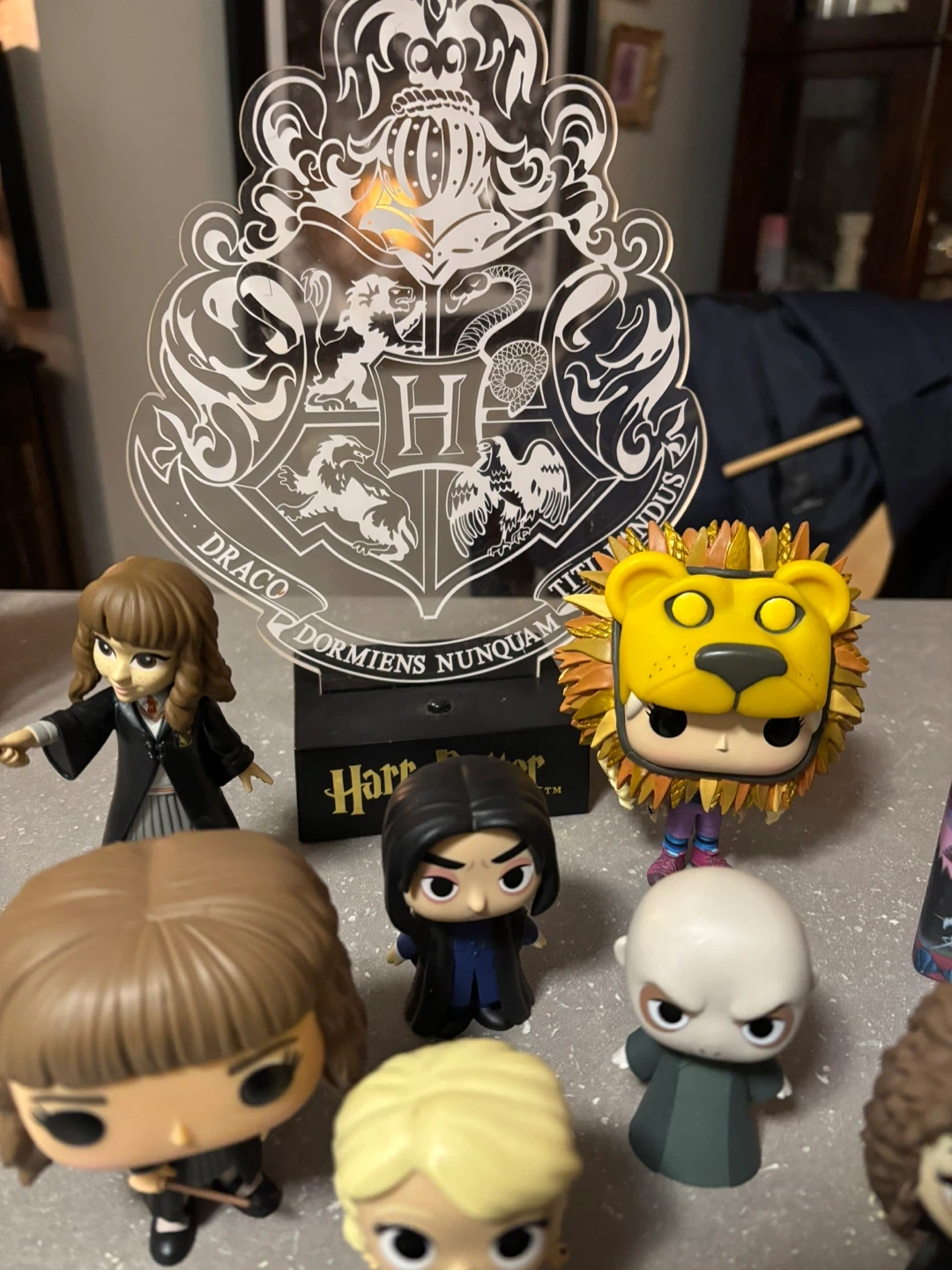 A collection of Funko Pop vinyl figures from the Harry Potter series, featuring characters and creatures. These collectible figures are great for any Harry Potter fan's display. Includes a Hogwarts crest stand.