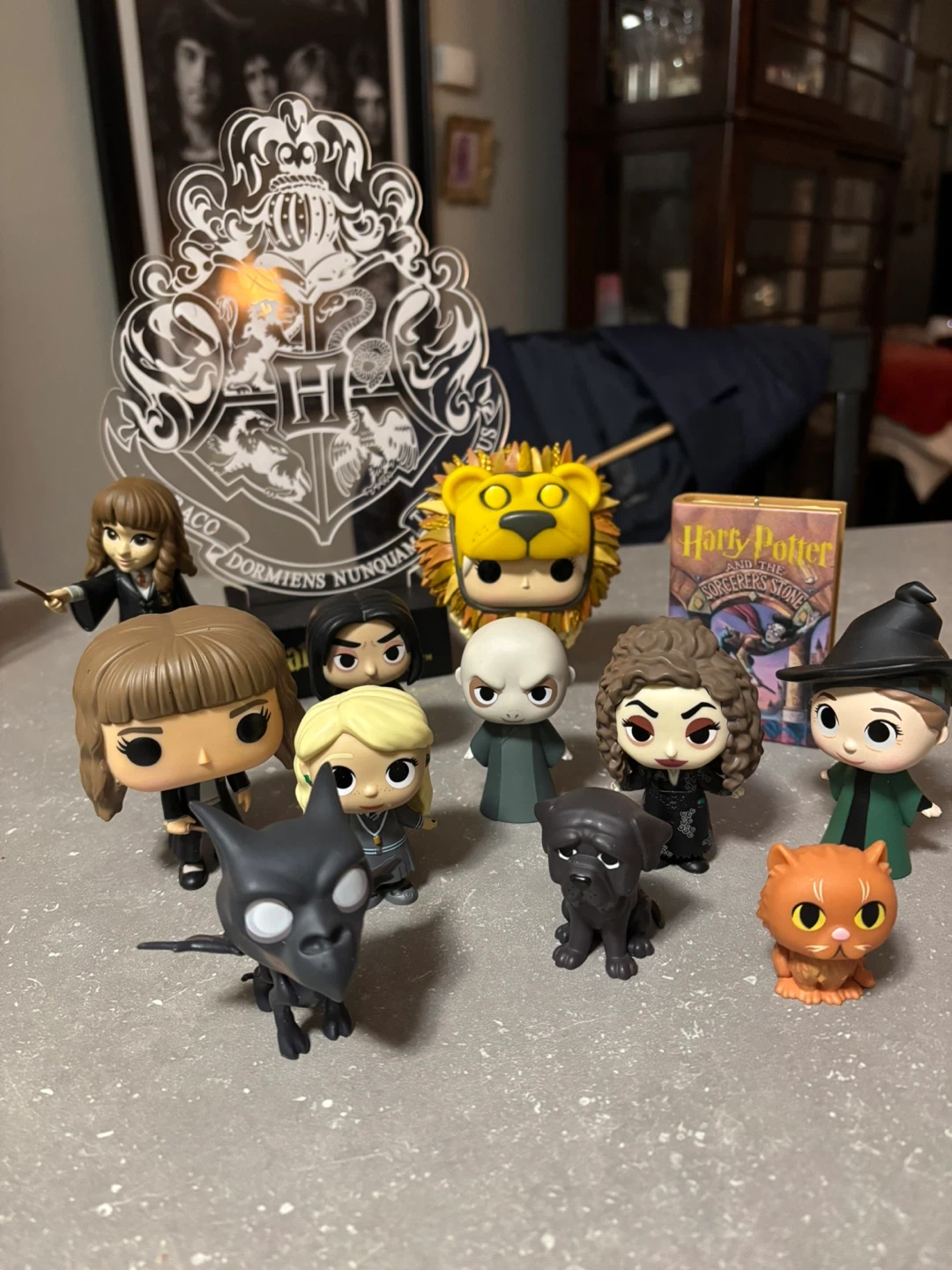 A collection of Funko Pop vinyl figures from the Harry Potter series, featuring characters and creatures. These collectible figures are great for any Harry Potter fan's display. Includes a Hogwarts crest stand.