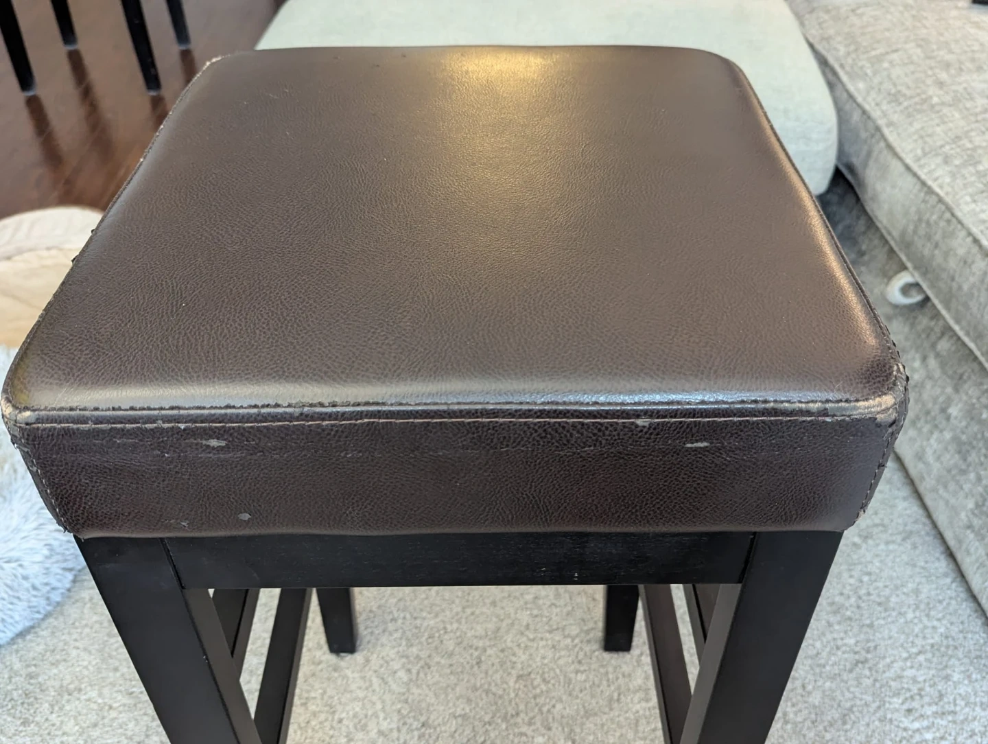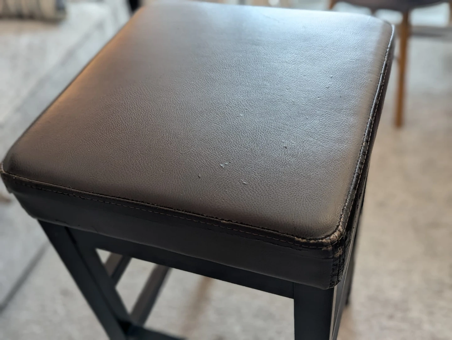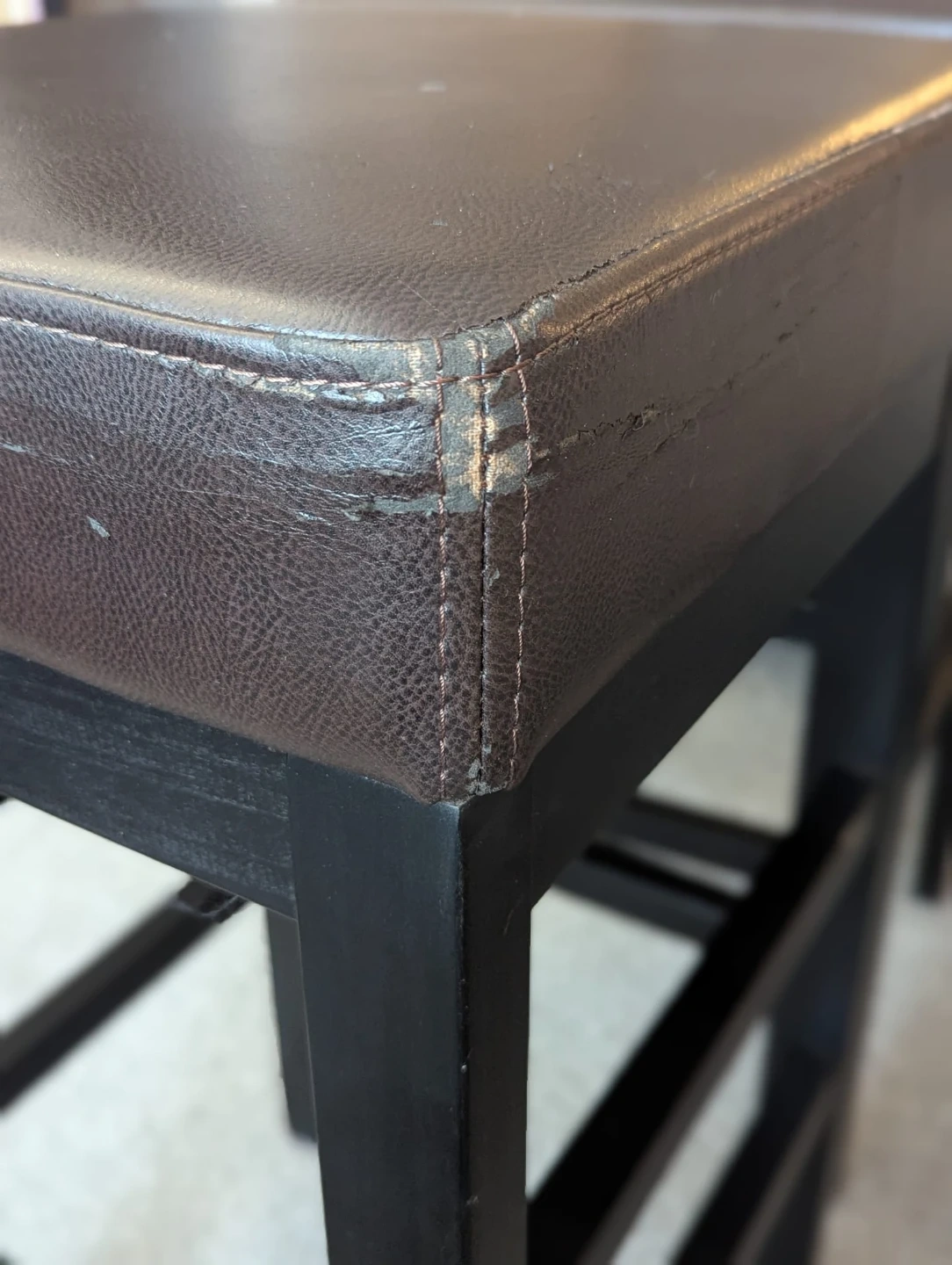 Selling two stools with a brown padded top and black legs. It shows some signs of wear, as seen in the photos. It's still sturdy and functional, great for adding extra seating!