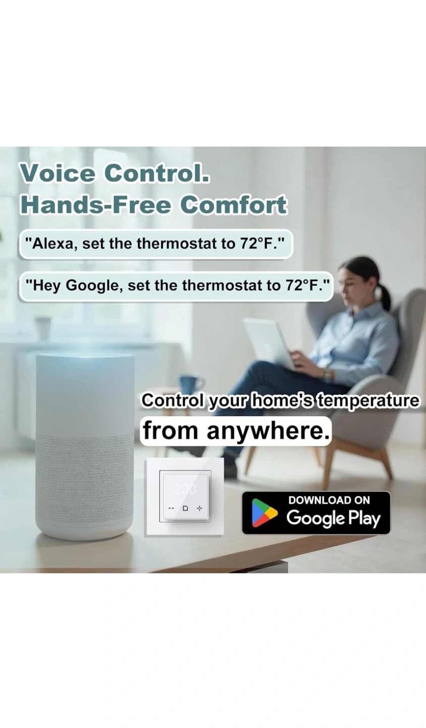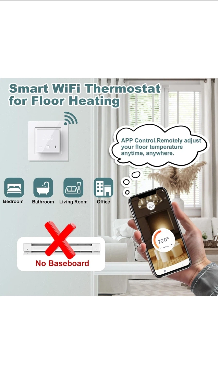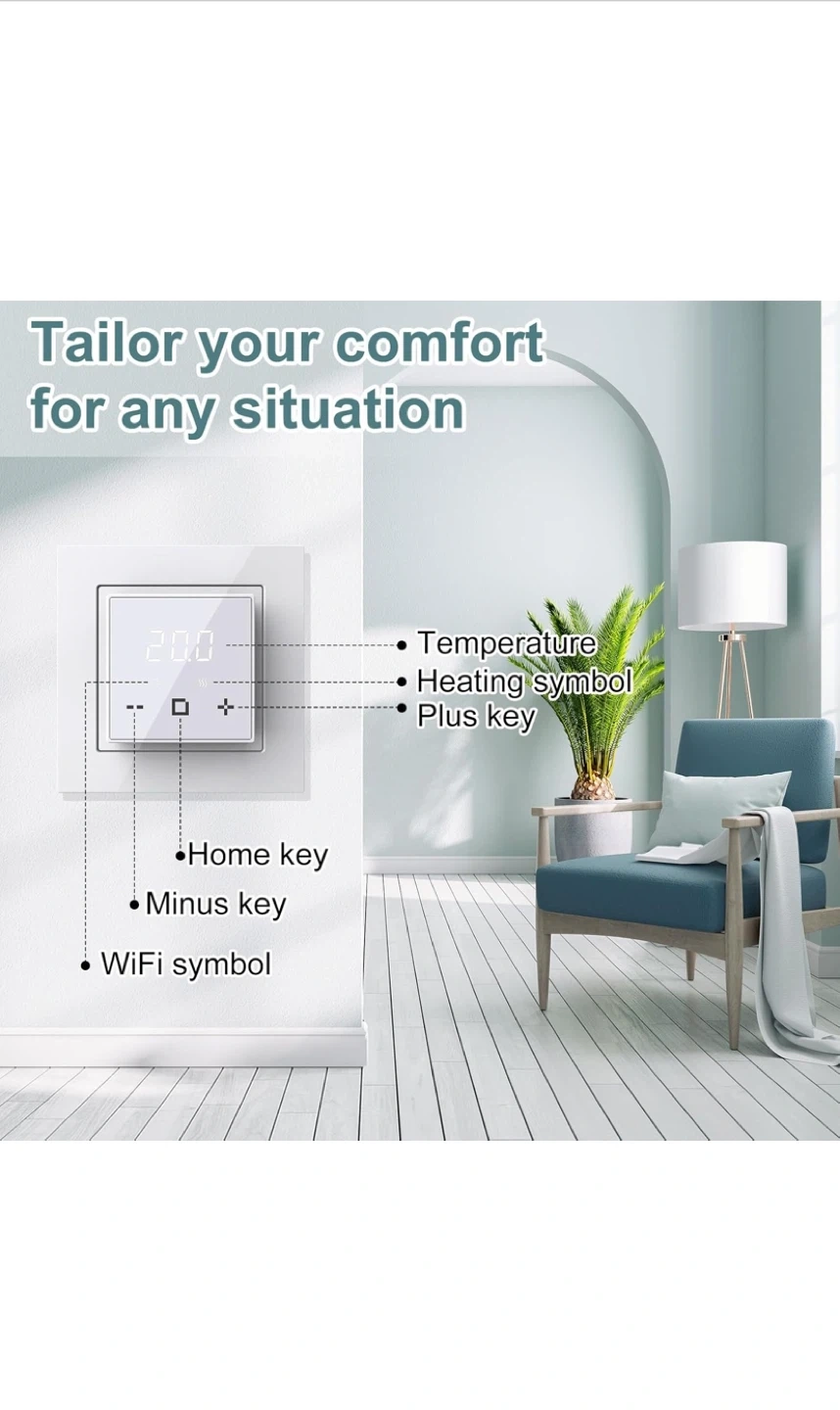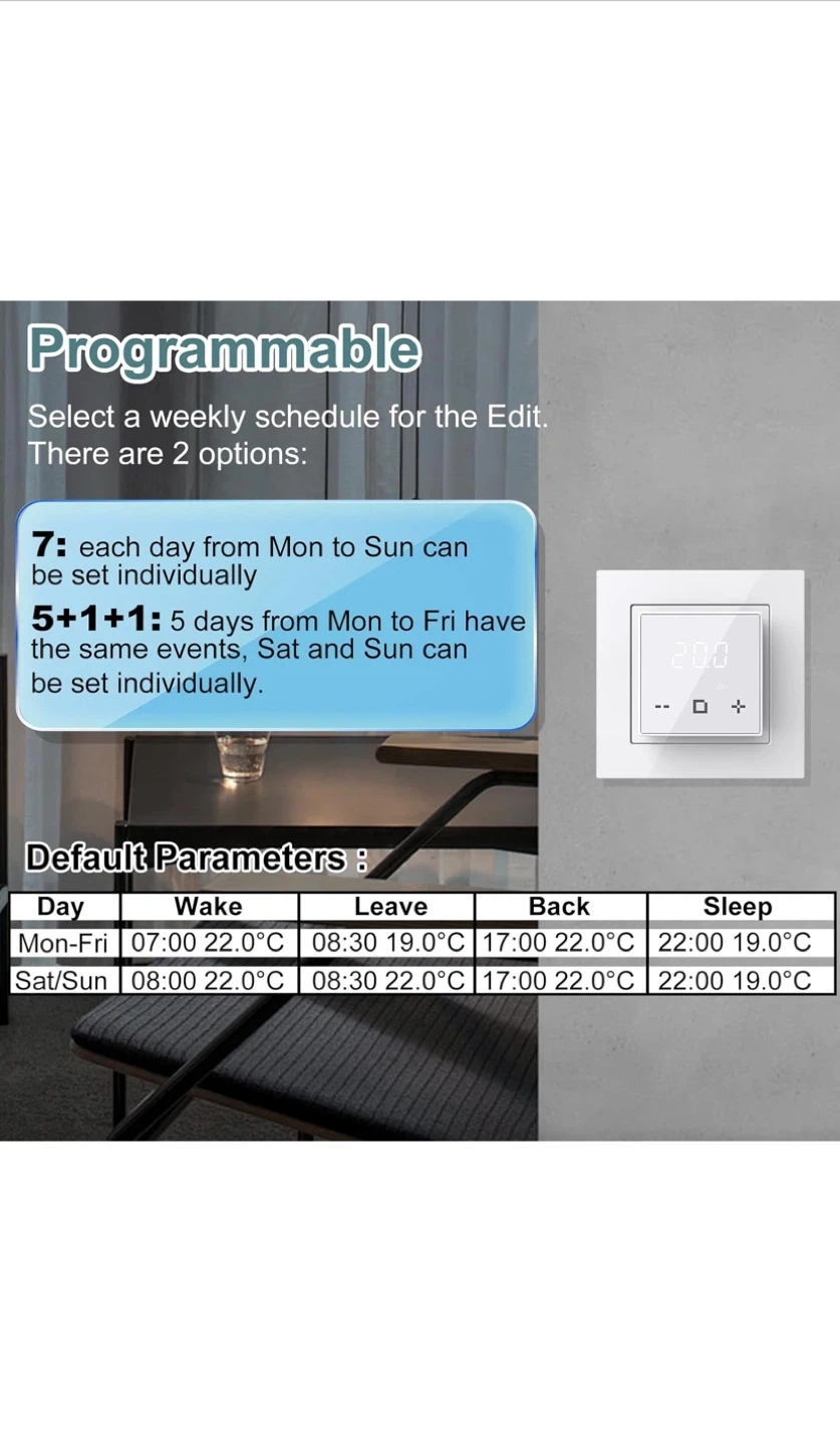 This programmable thermostat is designed for electric underfloor heating systems. It offers features like Child Lock, Anti-frozen Function, APP Remote control, and Holiday Mode. Voltage is 120-240Vac 50/60Hz with a max load of 16A for resistive loads. You can tailor your comfort for any situation with weekly scheduling options.