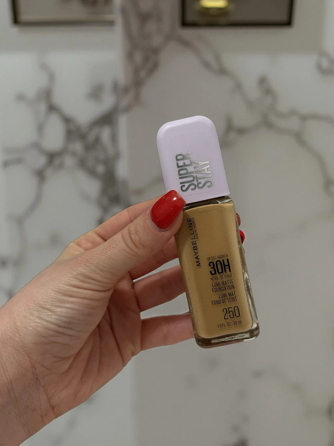 Maybelline Super Stay Lumi-Matte Foundation in shade 250. This foundation offers up to 30 hours of wear. It's a 1.0 fl oz / 30 ml bottle.