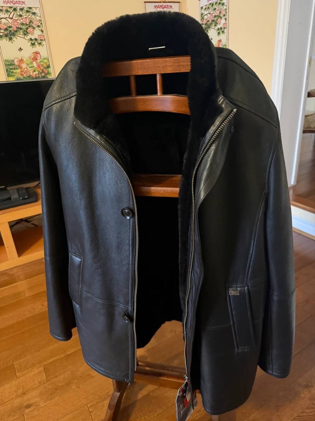 This is a black leather jacket lined with shearling for warmth. It features a full zip front with button closure. Genuine leather and shearling material.