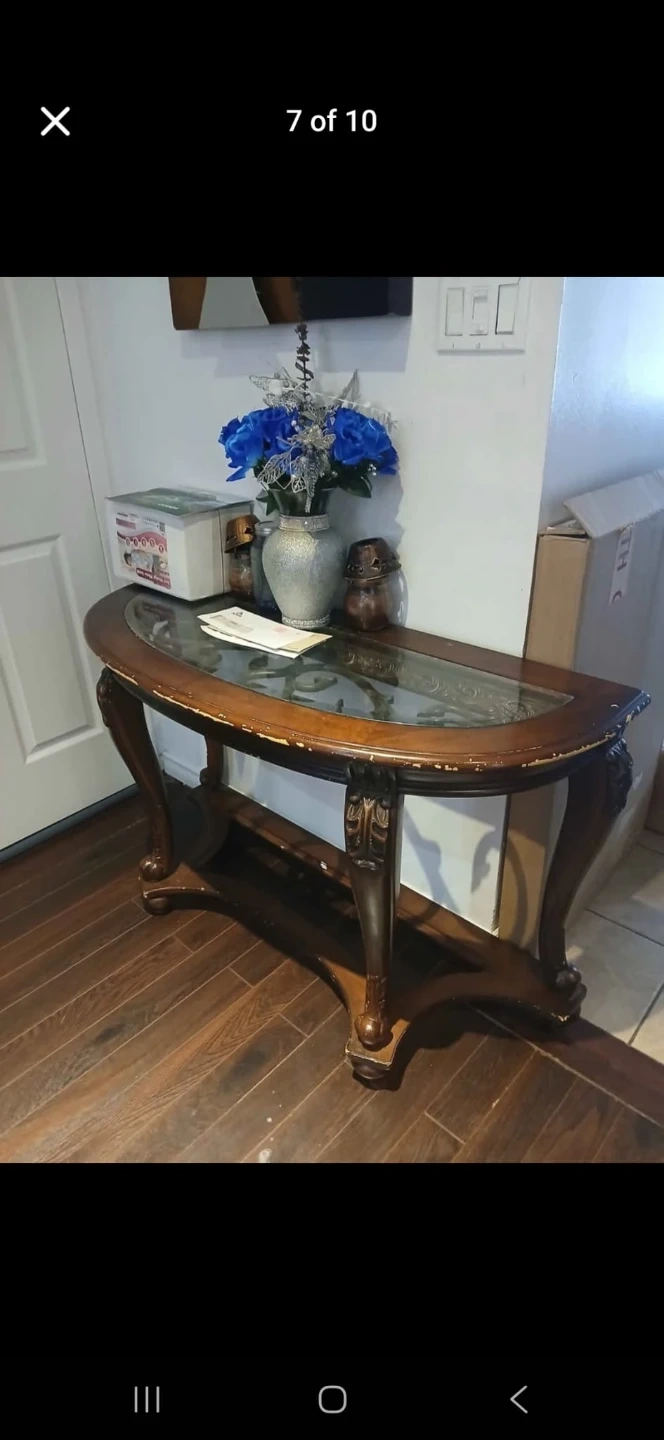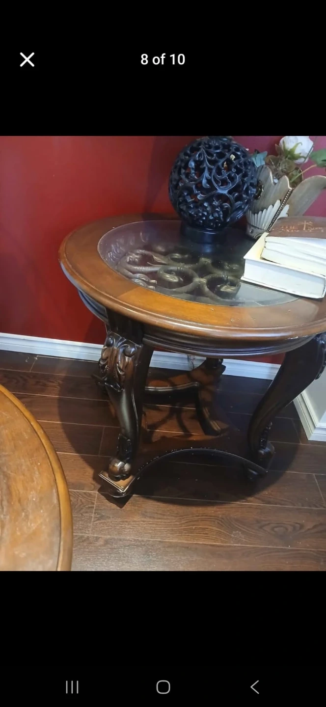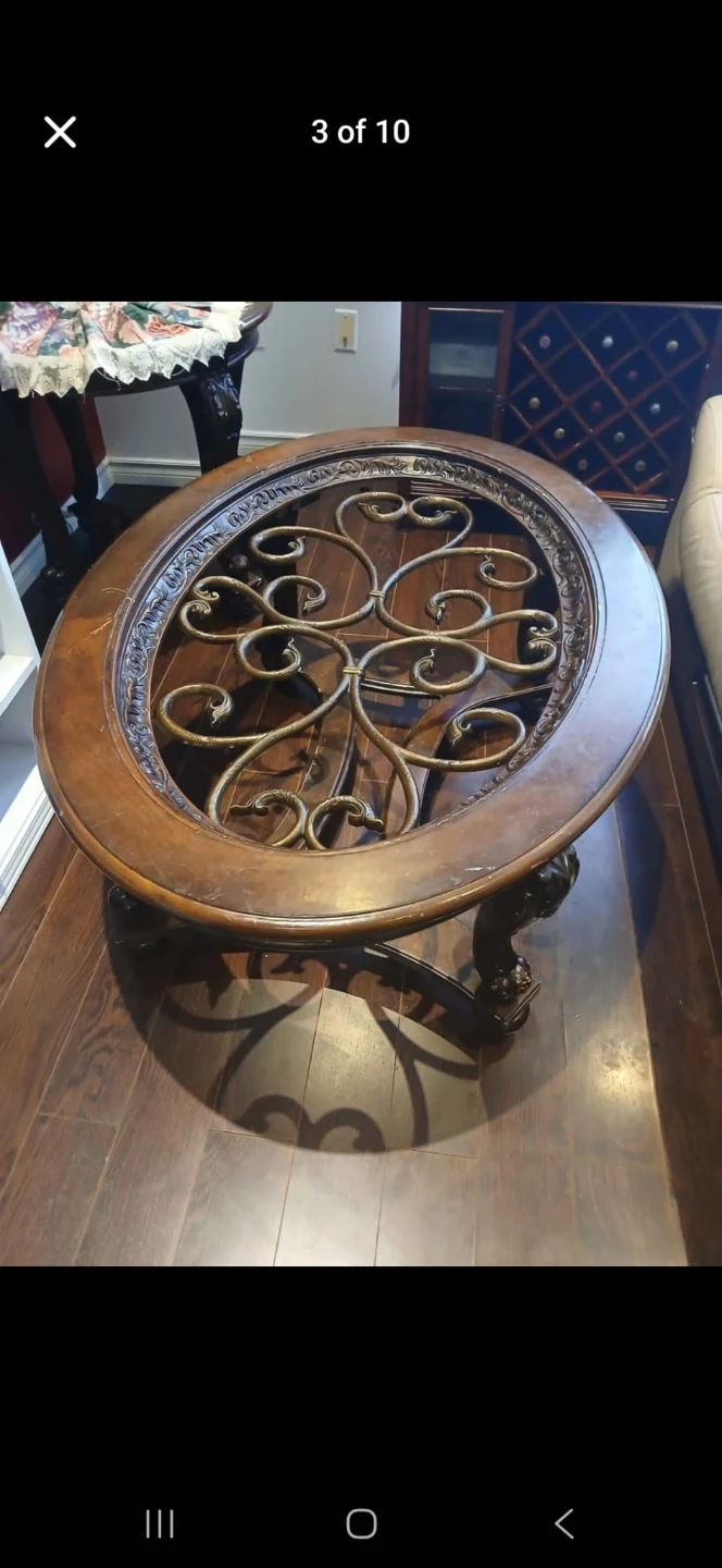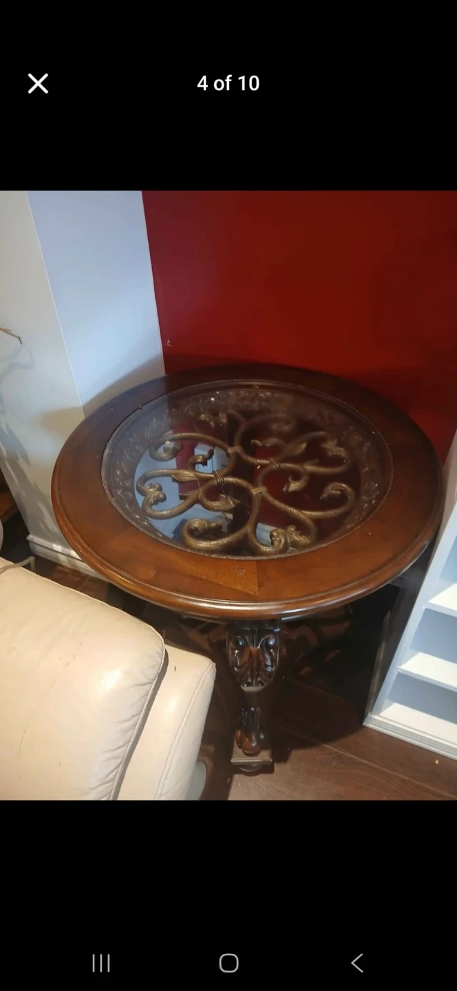This accent table features a round wooden frame with an ornate metal inlay design beneath a clear glass top. It's supported by a carved pedestal base. It's a great piece for hallways or living rooms.