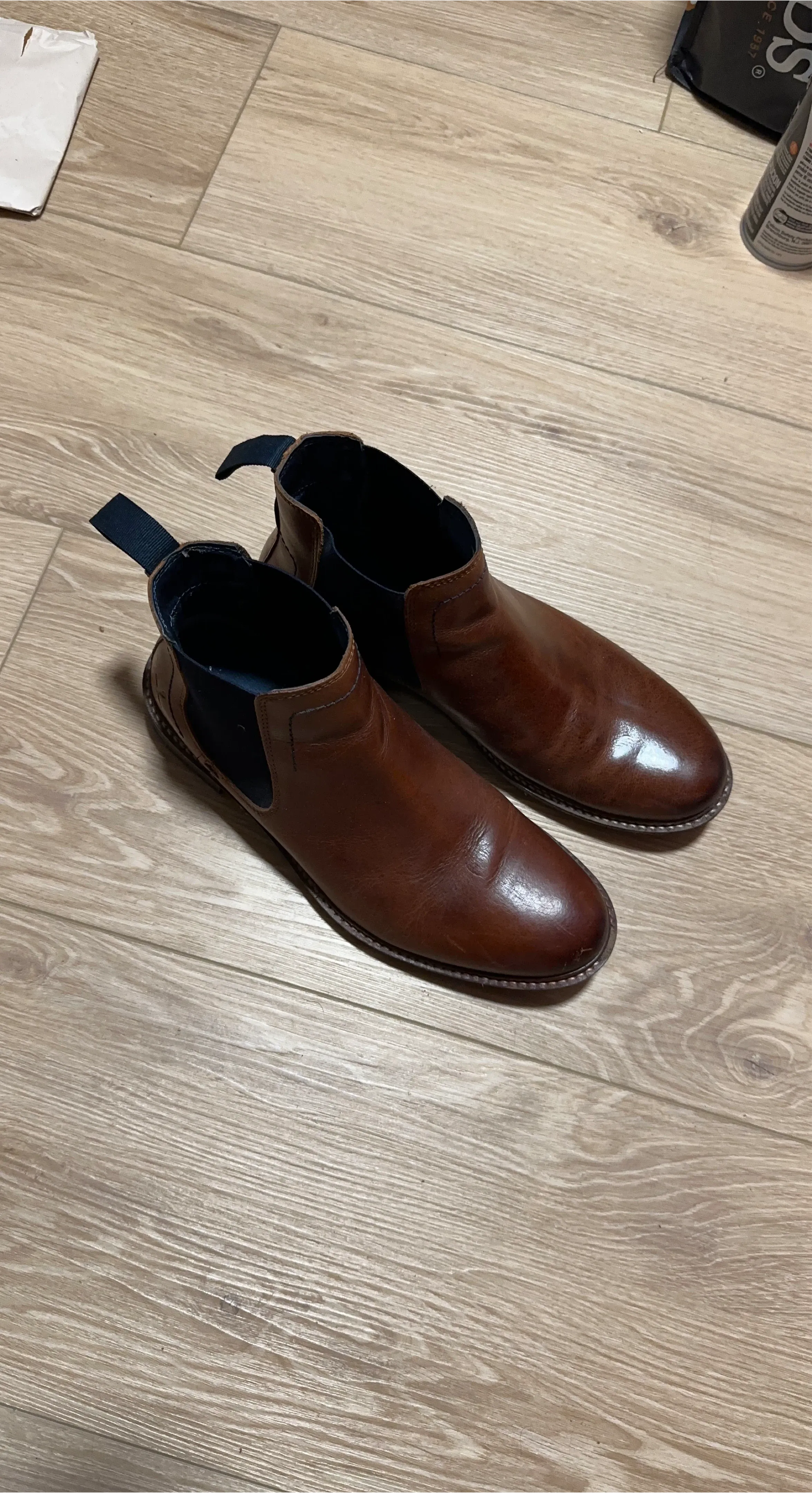 Hardly used a couple of times. Classic brown leather Chelsea boots. They feature elastic side panels and pull tabs for easy wear. These boots are made of genuine leather.
