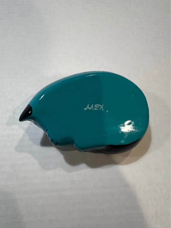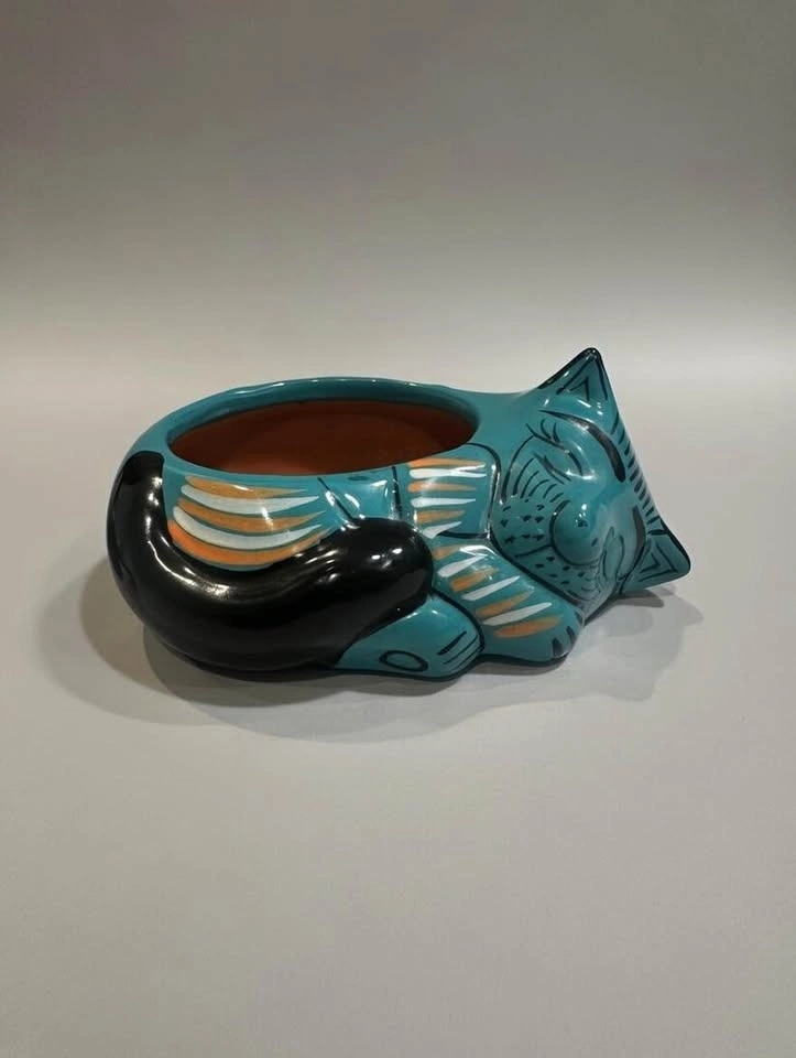Hand-painted Mexican folk art cat bowl. Glossy turquoise glaze cat with floral details. Excellent condition with no chips or cracks. Perfect as a decorative piece, trinket bowl, or for cat lovers and folk art collectors. Approx 5” long.