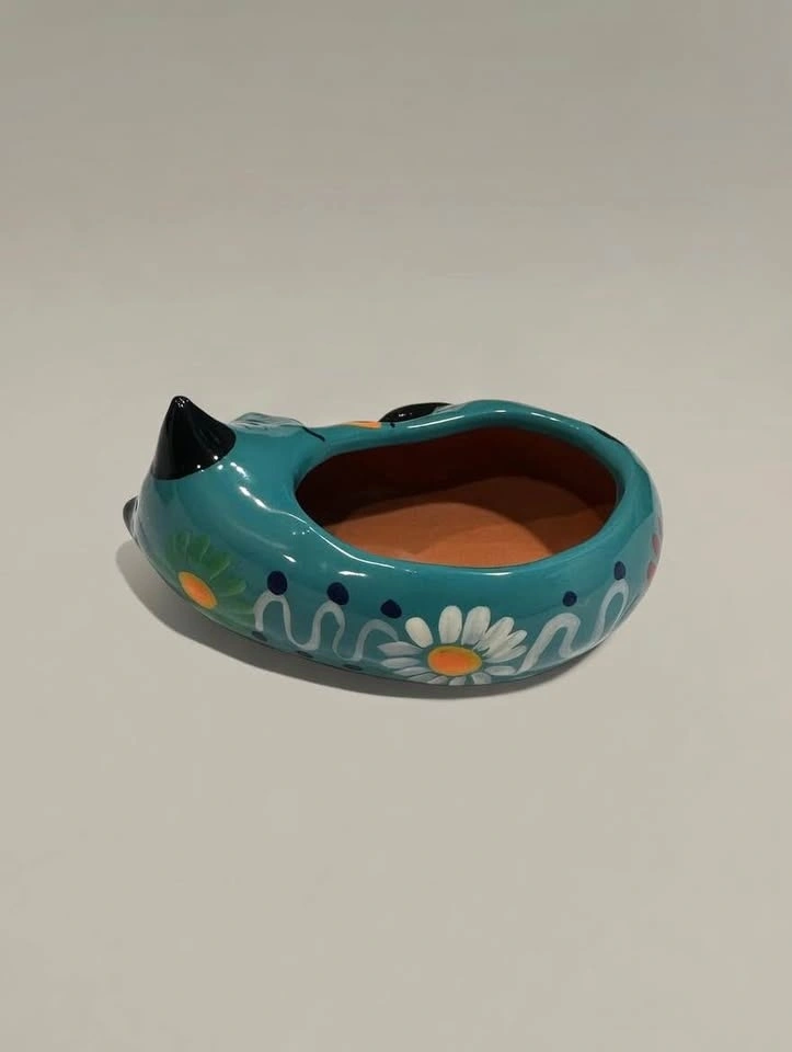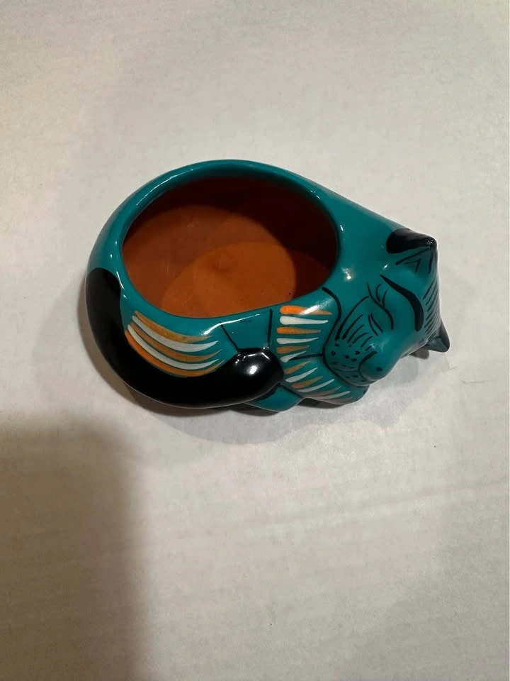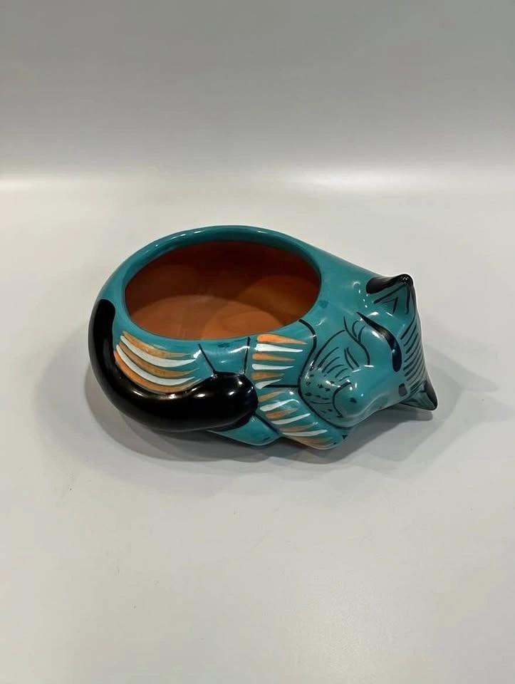 Hand-painted Mexican folk art cat bowl. Glossy turquoise glaze cat with floral details. Excellent condition with no chips or cracks. Perfect as a decorative piece, trinket bowl, or for cat lovers and folk art collectors. Approx 5” long.