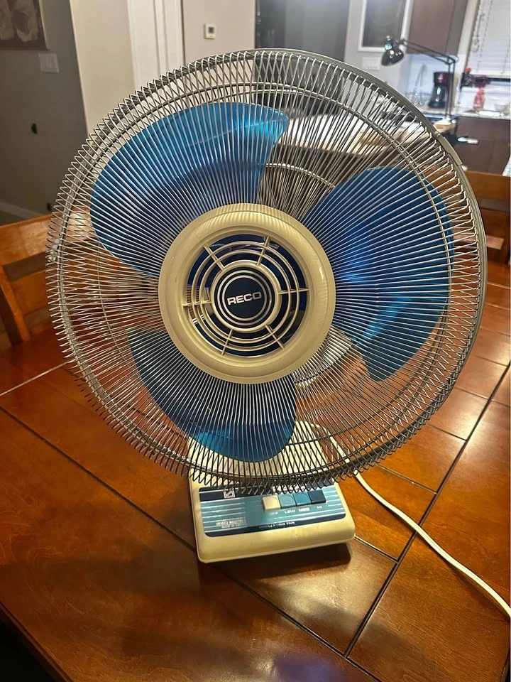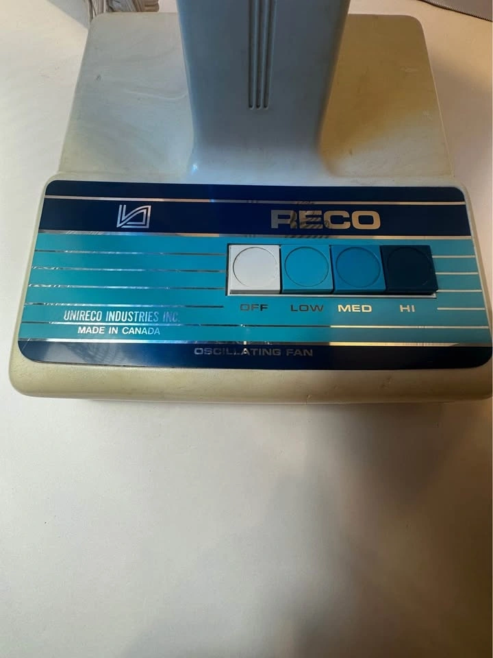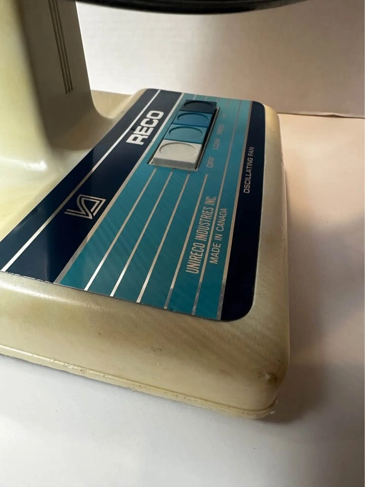 Beautiful vintage RECO oscillating table fan, made in Canada by Unireco Industries. This is a solid, well-built fan from the late 1970sβearly 1980s, not a modern lightweight plastic unit.