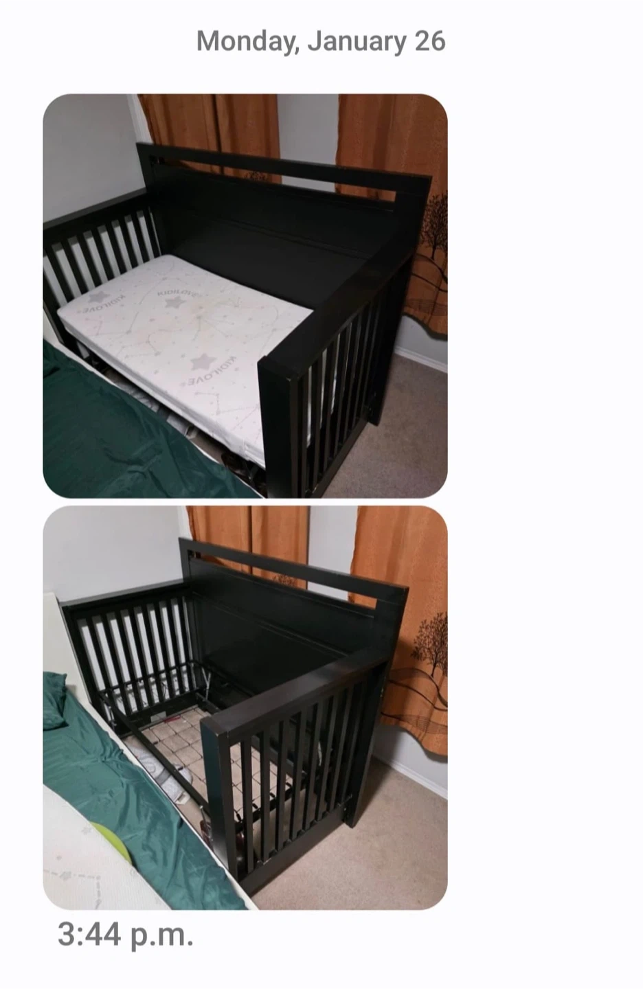 Buy & SellDark CribDark Crib$40Dark coloured crib with slatted sides. Includes the mattress frame. Mattress not included. It's in good condition.ConditionGoodAge1-2 yearsWHERE TO MEETLaurelView MapSELLERHarjeetLaurel100 reviews1 chats·0 favorites·27 viewsSEND CHAT TO SELLERHi Harjeet! I’m interested in your listing.Hi Harjeet! I’m interested in your listing.Get the Karrot app to chatSign In to chat