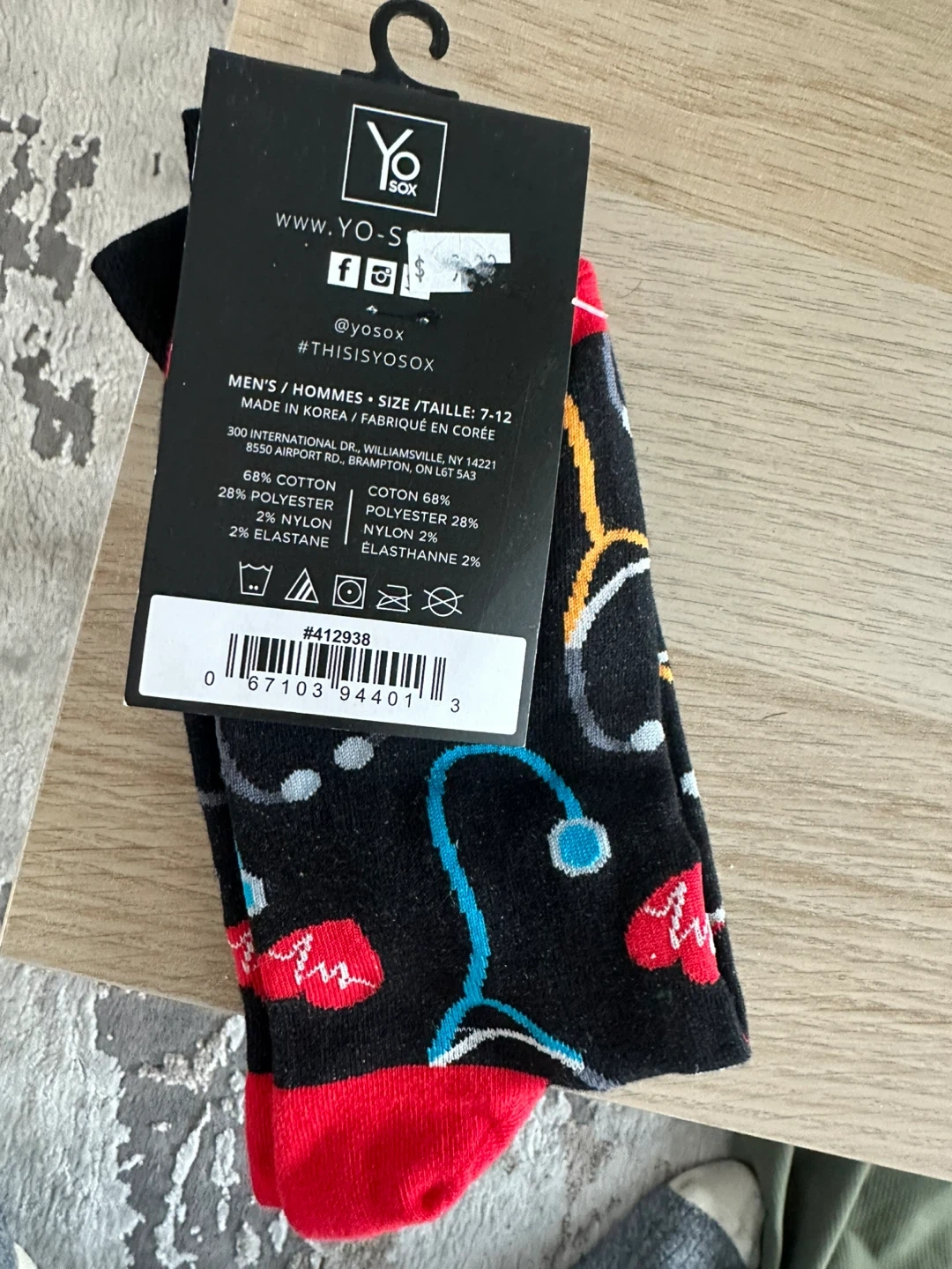 These fun YOSOX crew socks are designed for men, featuring a playful stethoscope and heart print on a black background with red accents. They're made from a comfortable cotton blend, perfect for healthcare professionals or anyone with a sense of humour! The size is 7-12.