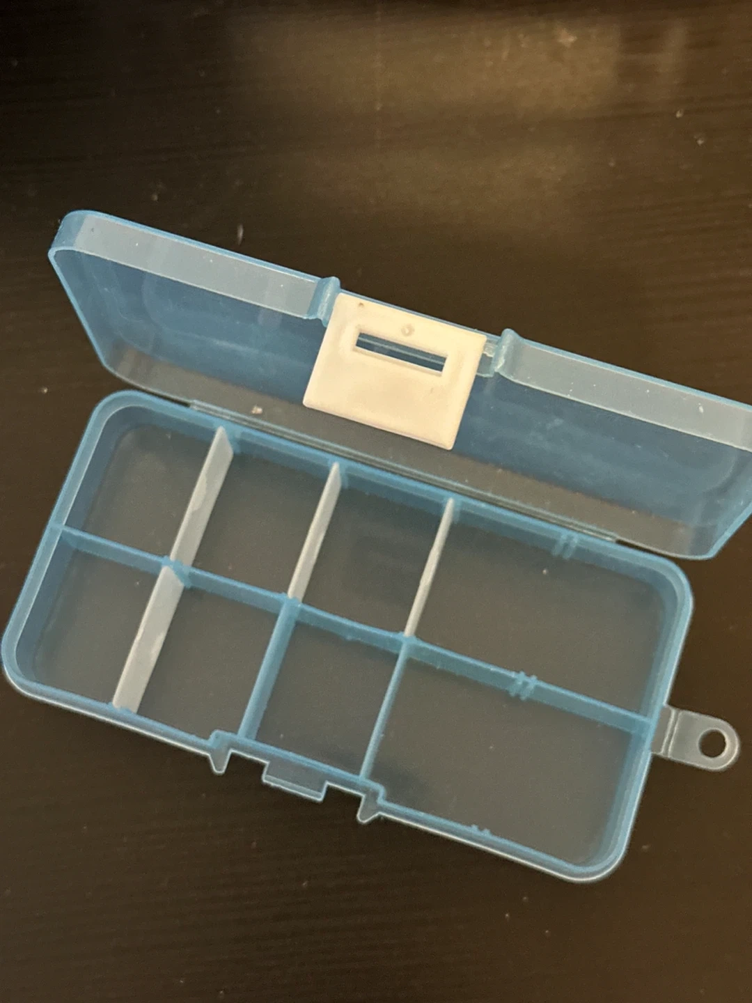 This blue plastic organizer box has 10 individual compartments. It's perfect for storing small items like beads, screws, or craft supplies. The lid securely snaps shut to keep everything in place.