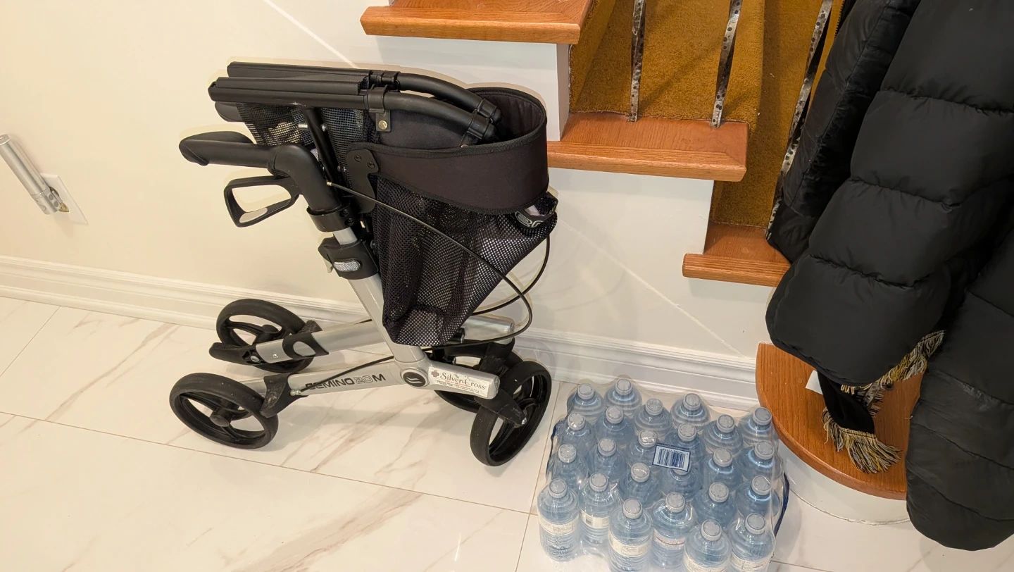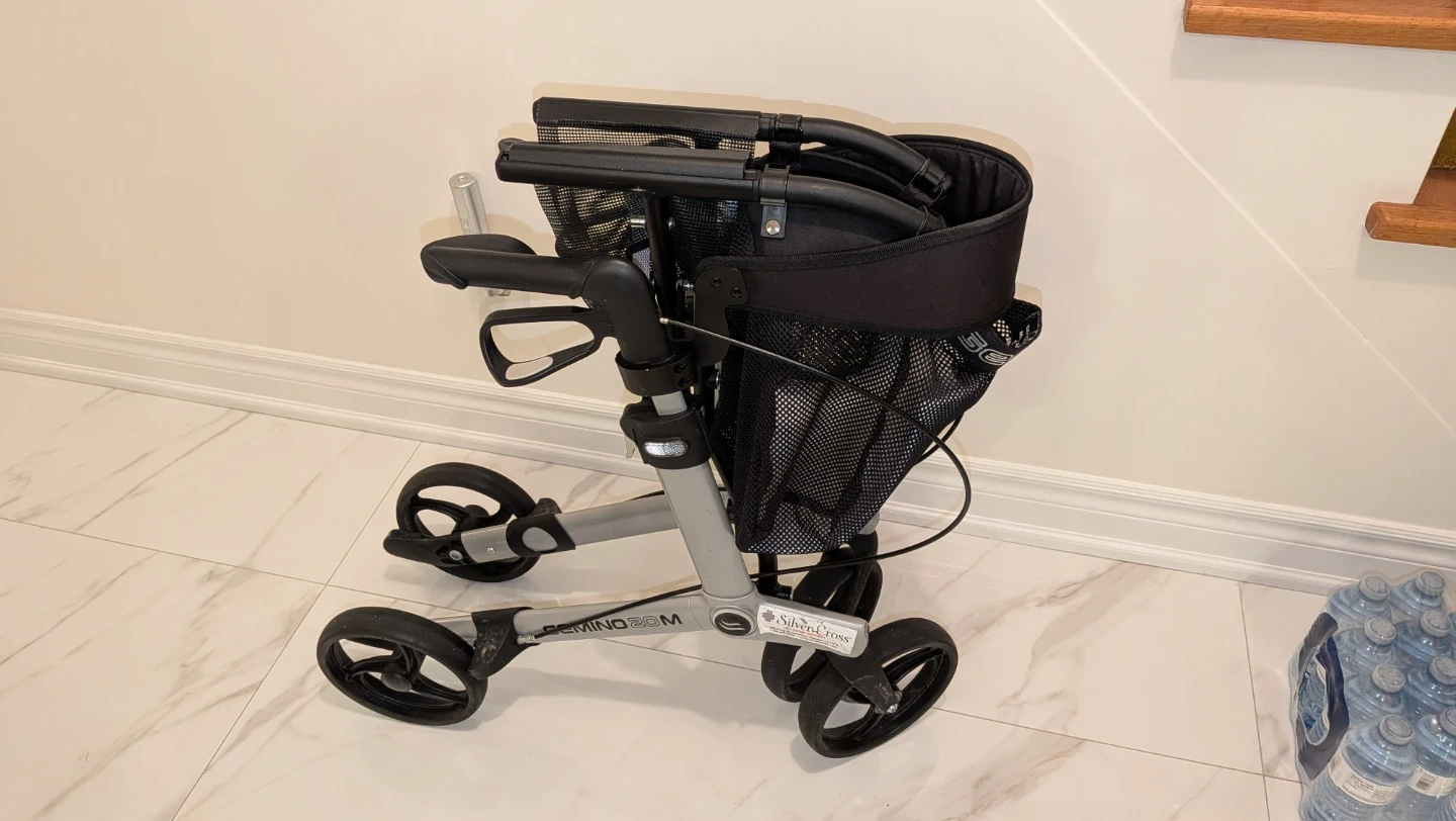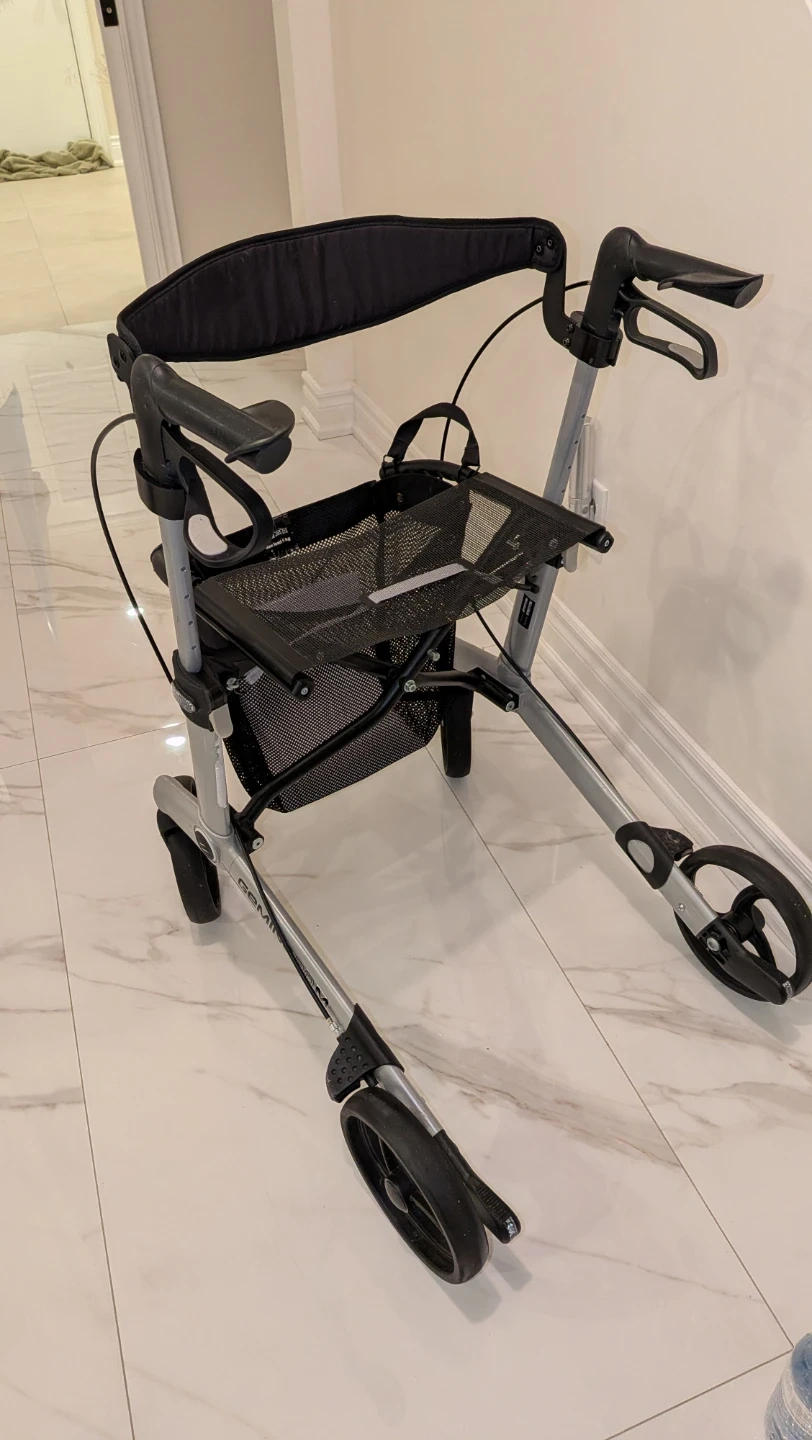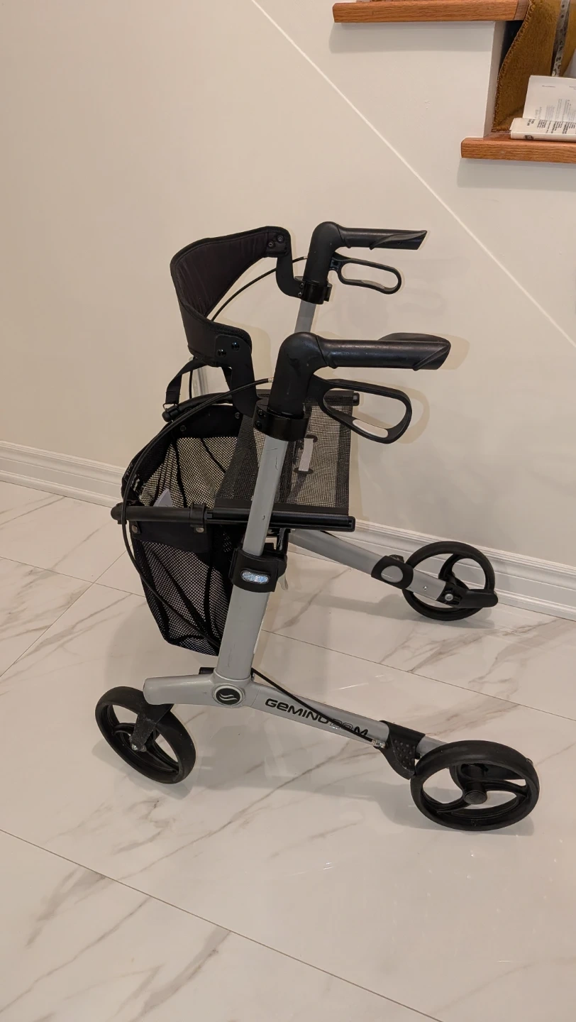 Gemino 20M walker rollator with a basket and seat. It's a helpful mobility aid for navigating spaces. It folds for easier storage and transport. All components work, rolls smoothly collapses with ease
