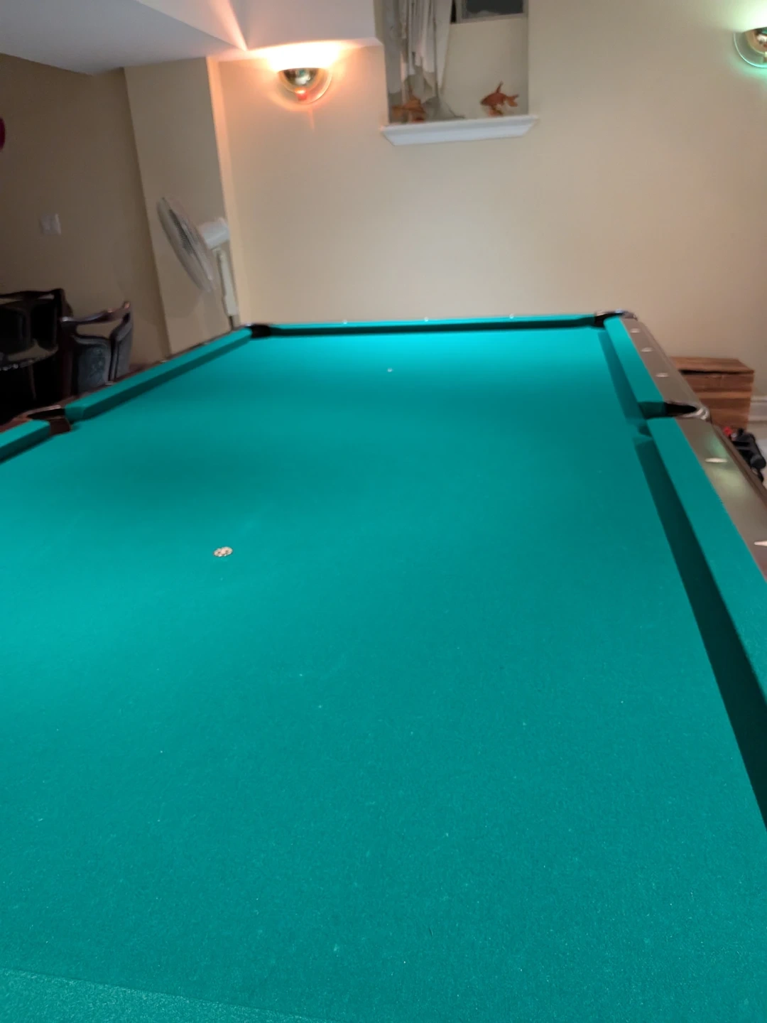 Nice pool table with a green felt surface. Includes a set of pool cues, balls and a wooden rack for storage. Ready for your games room!