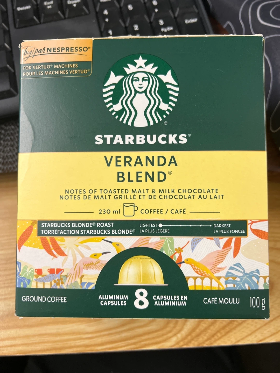 Starbucks Veranda Blend aluminum capsules for Vertuo machines. This ground coffee is 100g and offers notes of toasted malt & milk chocolate. It's a light roast.