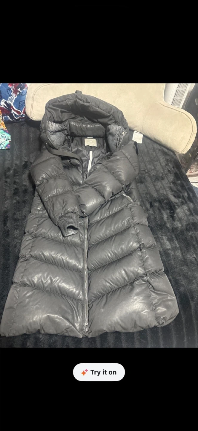 This is a SOIA & KYO puffer coat. It's a dark grey, hooded, full-zip jacket with a shiny finish. The jacket has a quilted design and ribbed cuffs. Pick yo cash only