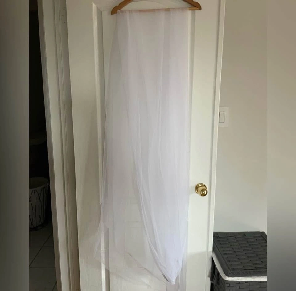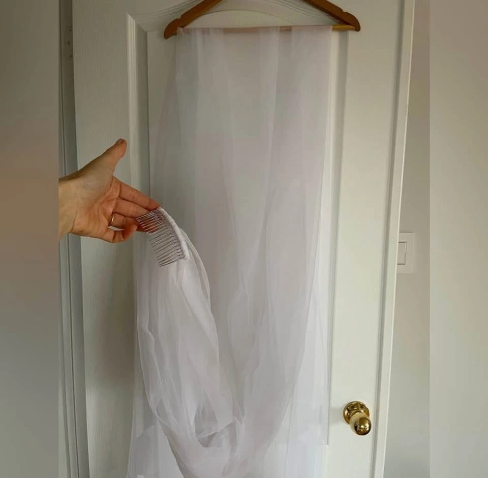 Designer quality cathedral veil in pure white, purchased from a high-end bridal boutique. Features a luxurious sheer tulle fabric that flows beautifully and a sleek silver comb for secure and comfortable placement. Measurements: 118” L x 63” W. Ideal for brides looking for a classic, romantic finishing touch.