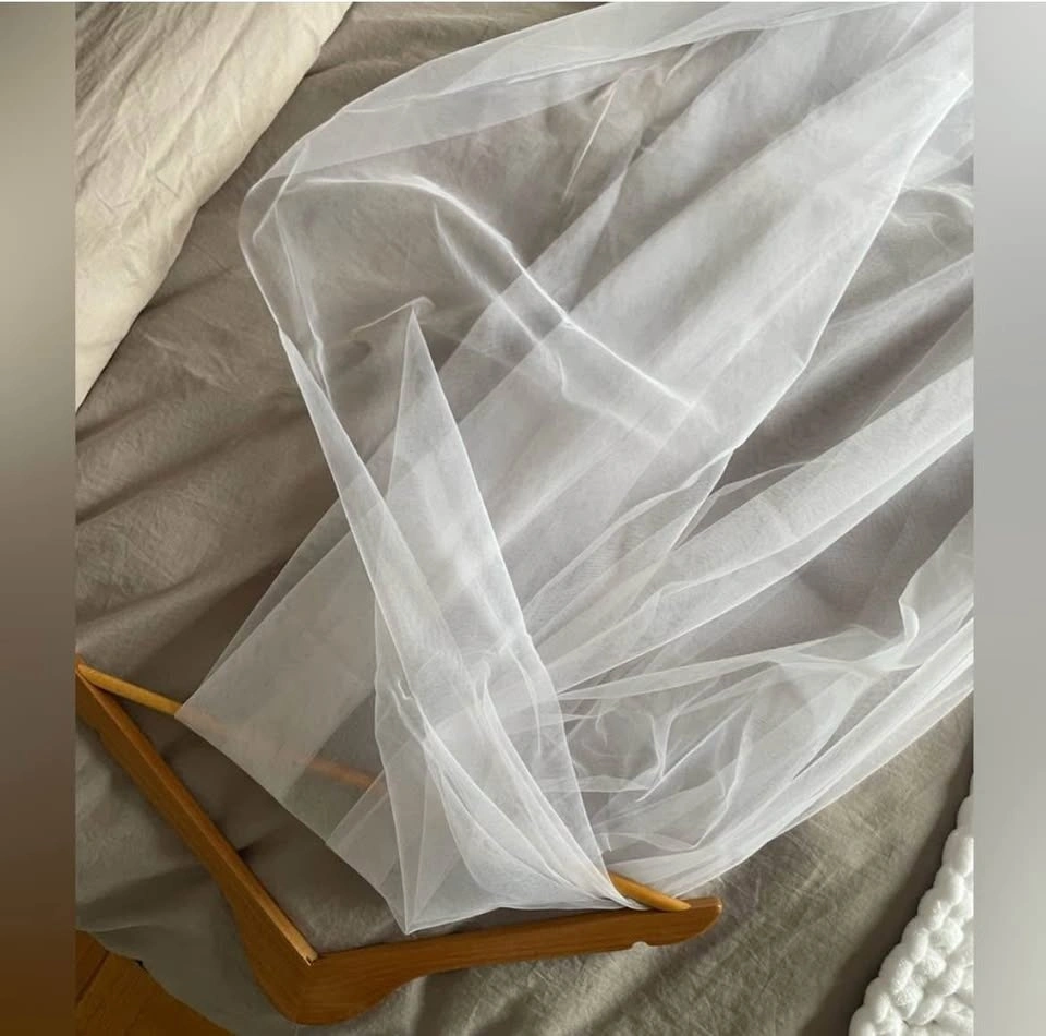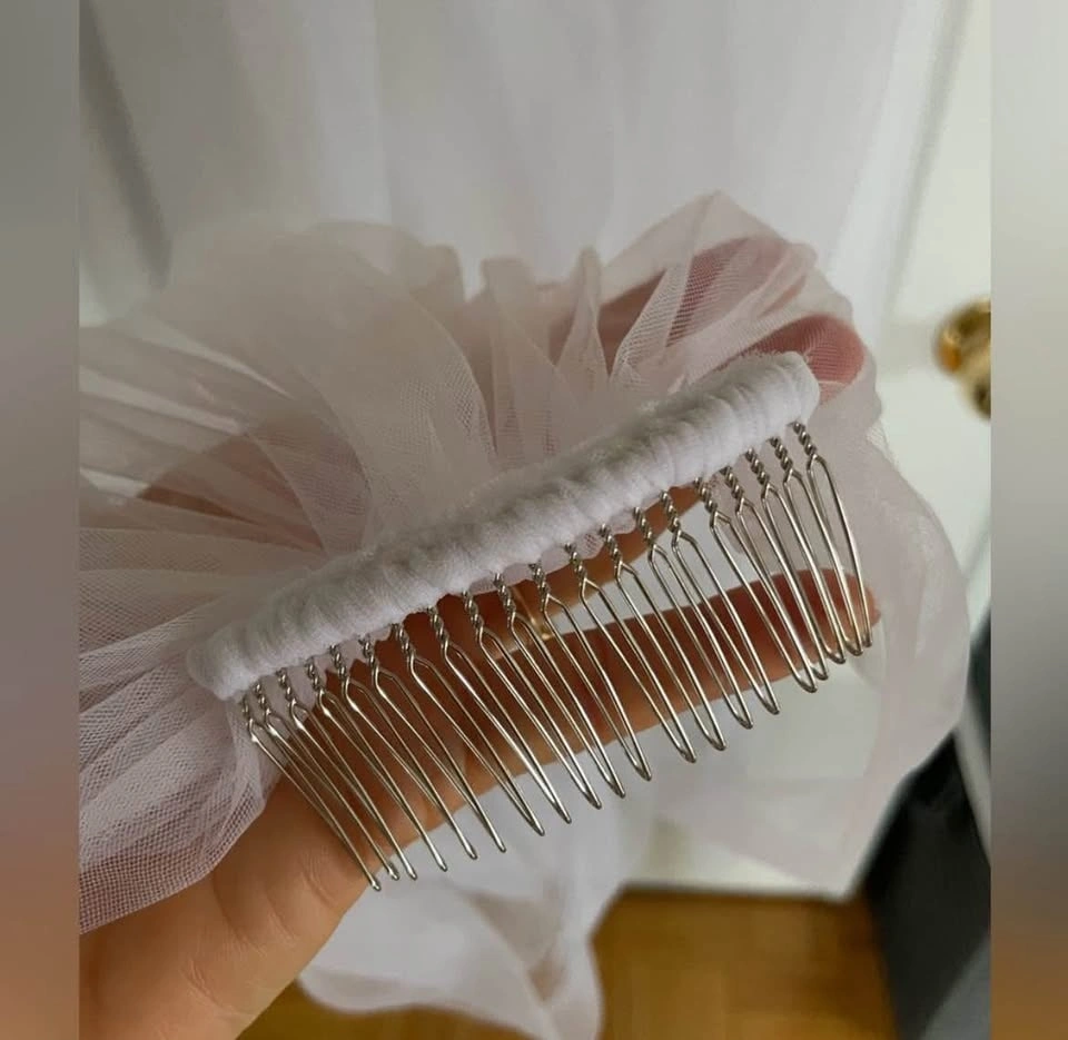 Designer quality cathedral veil in pure white, purchased from a high-end bridal boutique. Features a luxurious sheer tulle fabric that flows beautifully and a sleek silver comb for secure and comfortable placement. Measurements: 118” L x 63” W. Ideal for brides looking for a classic, romantic finishing touch.