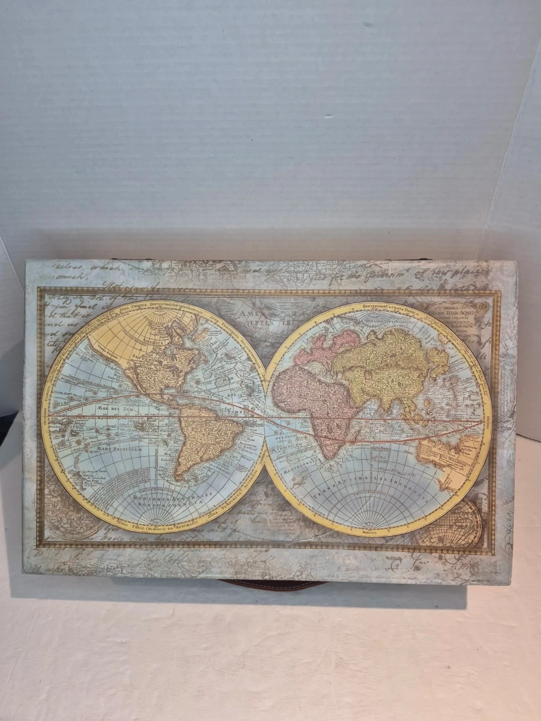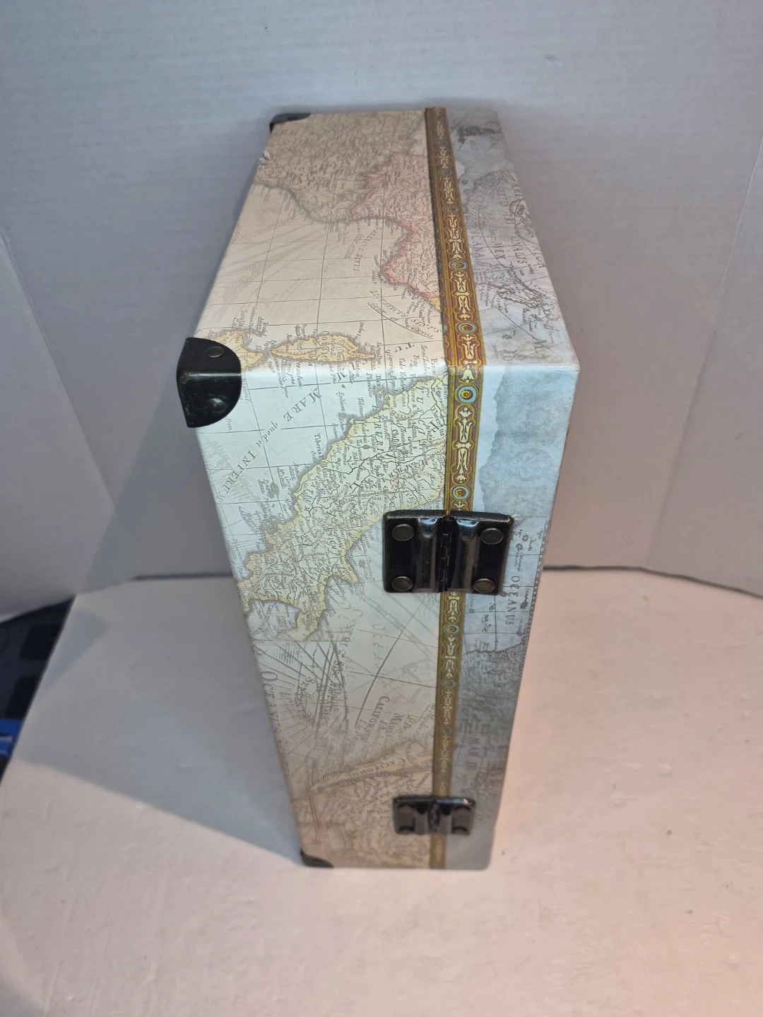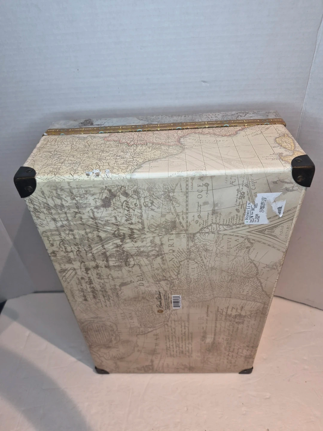 Medium size decorative trunk features a vintage world map design. It has a faux leather handle and metal latches for closure. It's a stylish way to store items. Made of hard cardboard