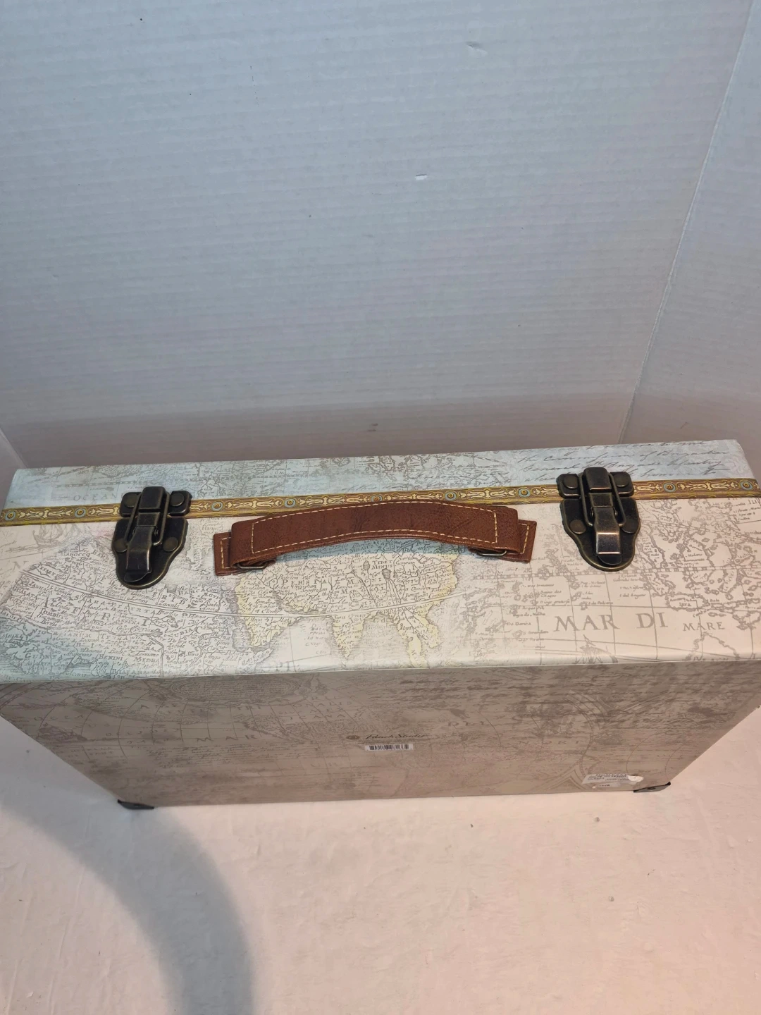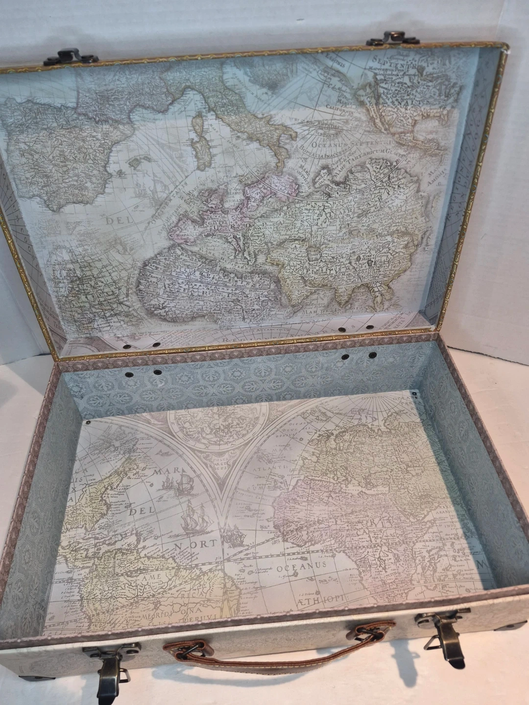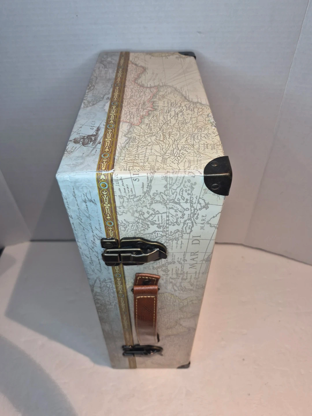Medium size decorative trunk features a vintage world map design. It has a faux leather handle and metal latches for closure. It's a stylish way to store items. Made of hard cardboard