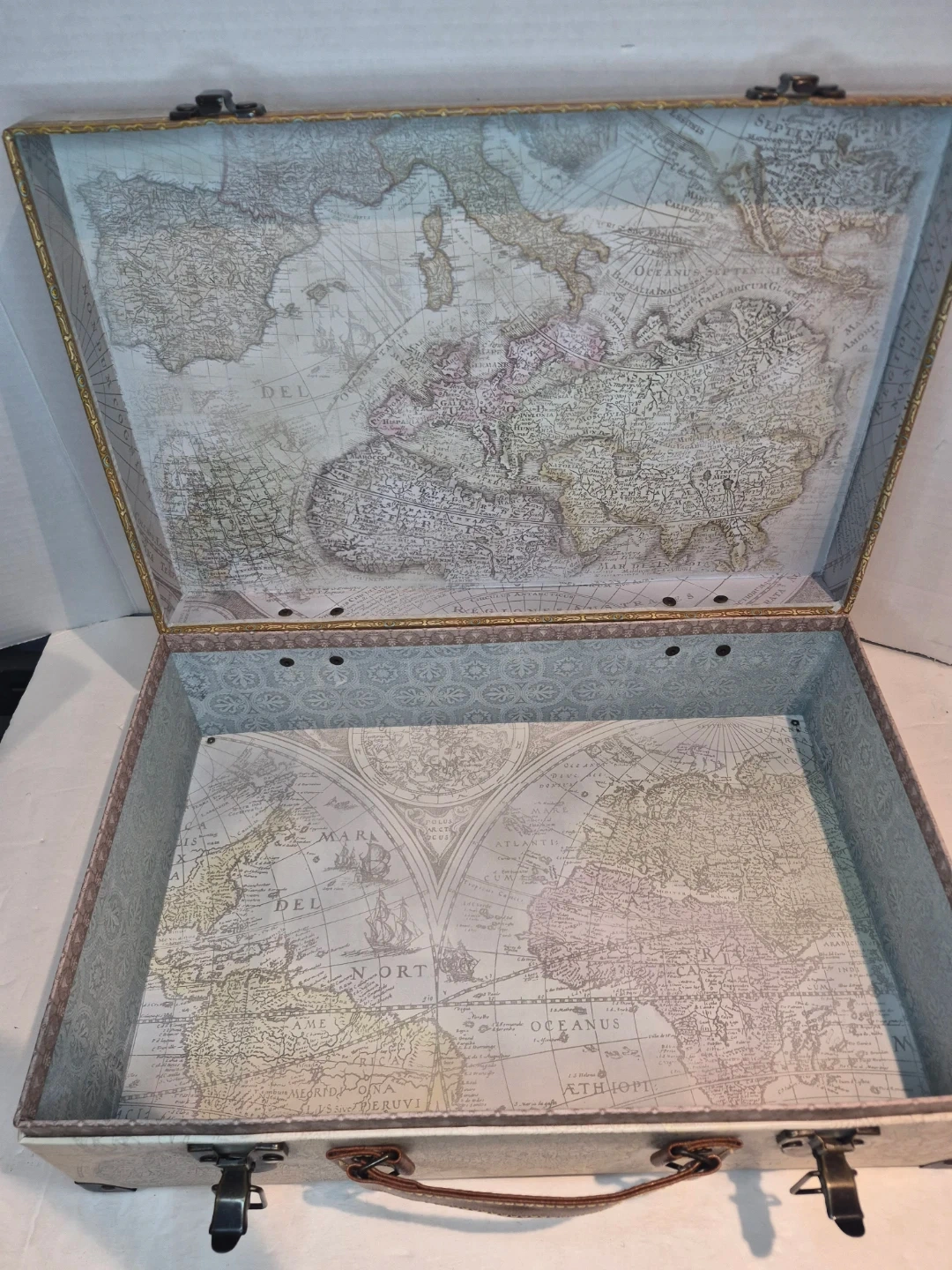 Medium size decorative trunk features a vintage world map design. It has a faux leather handle and metal latches for closure. It's a stylish way to store items. Made of hard cardboard