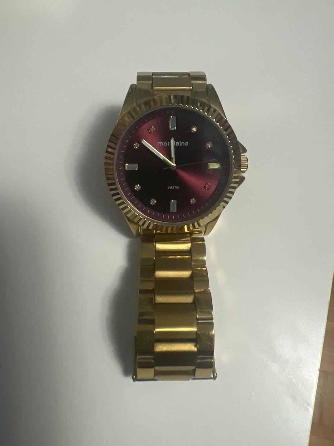 Montaigne gold tone wristwatch featuring a deep red dial with sparkling accent markers. Water resistant 3 ATM. This watch's classic design makes it suitable for everyday wear or special occasions.