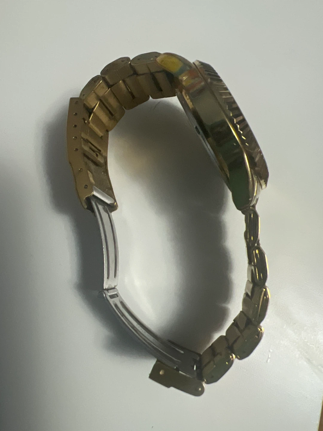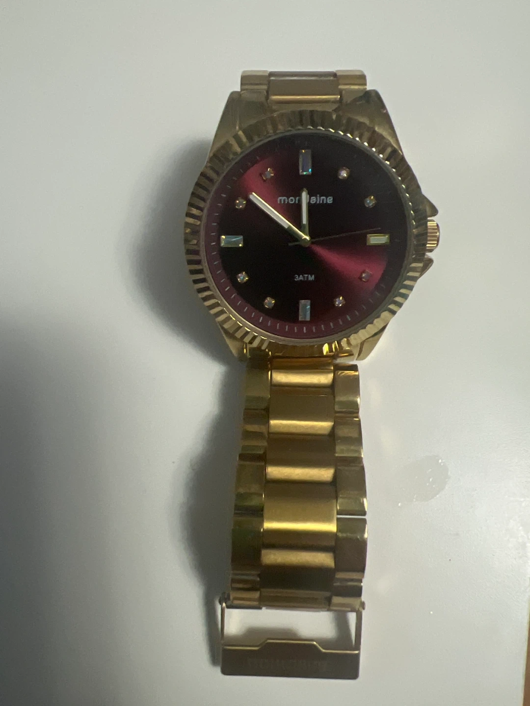 Montaigne gold tone wristwatch featuring a deep red dial with sparkling accent markers. Water resistant 3 ATM. This watch's classic design makes it suitable for everyday wear or special occasions.
