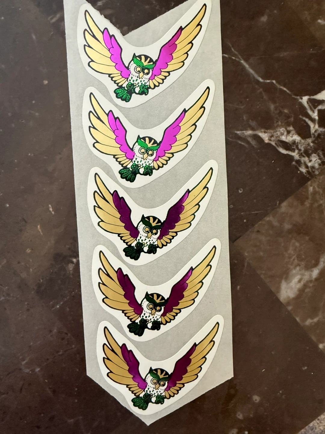 A sheet of 5 stickers featuring a colourful owl design. Each sticker shows a white owl with gold and magenta wings, holding green leaves. They're perfect for decorating laptops, water bottles, or journals!