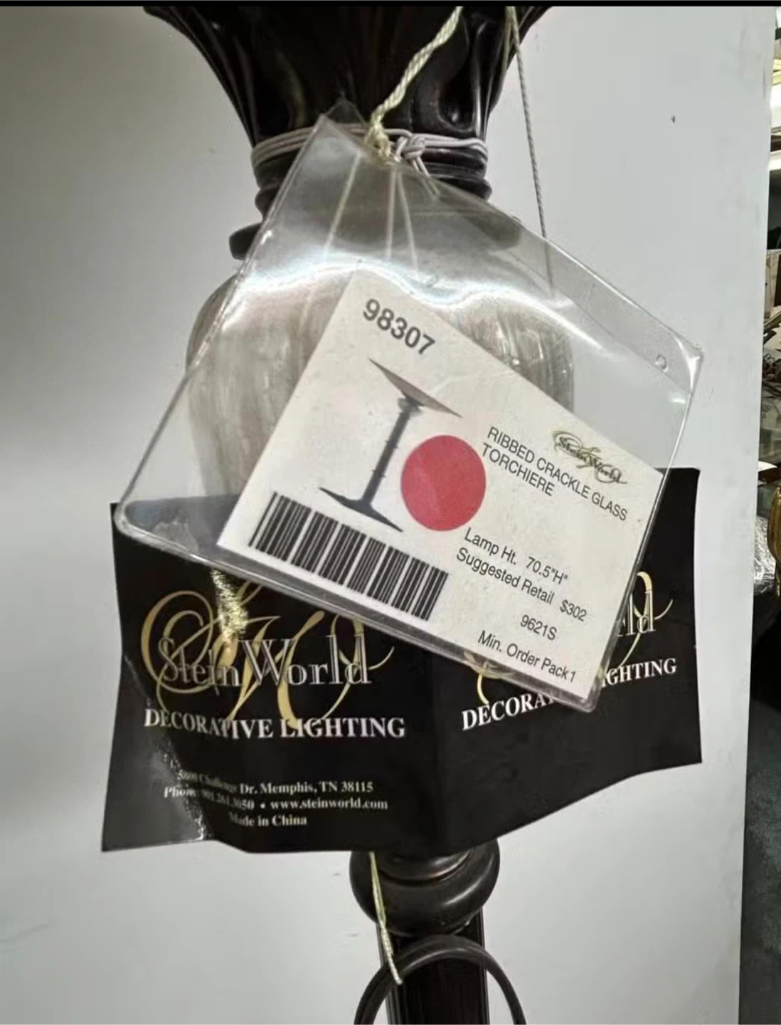 This Stein World torchiere floor lamp features a ribbed crackle glass accent. Lamp height is 70.5 inches. It's made in China and perfect for adding ambient lighting to a living room.