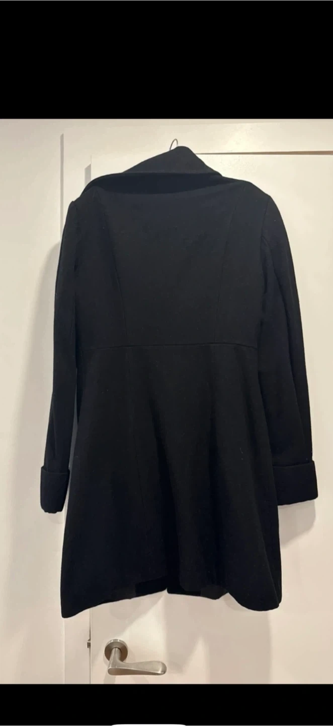 This is a stylish black women's coat. It features a classic collar and button-up front. The coat is made from a durable fabric. It's a great piece for cooler weather!