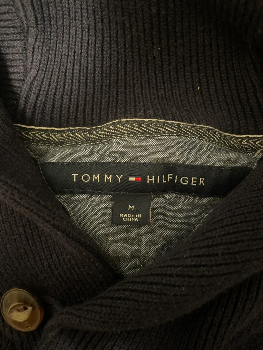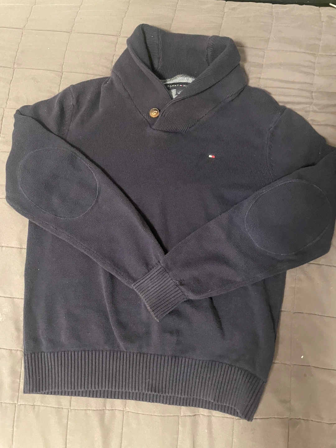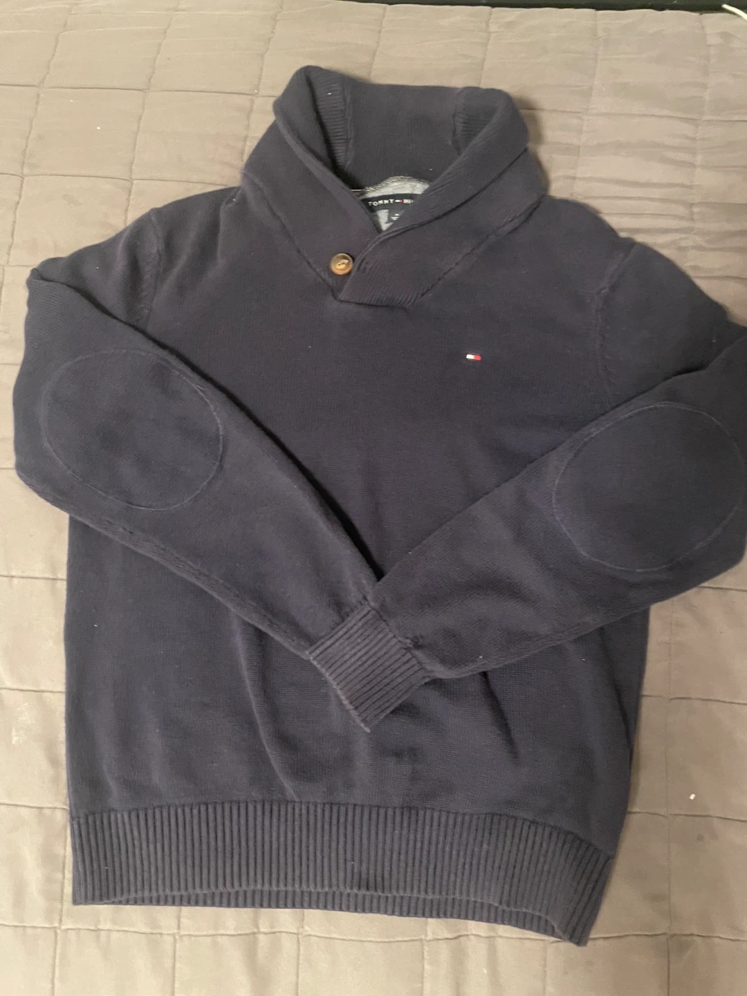 Tommy Hilfiger navy blue knit sweater with elbow patches. Features a shawl collar and button detail at the neck. It's a size medium.