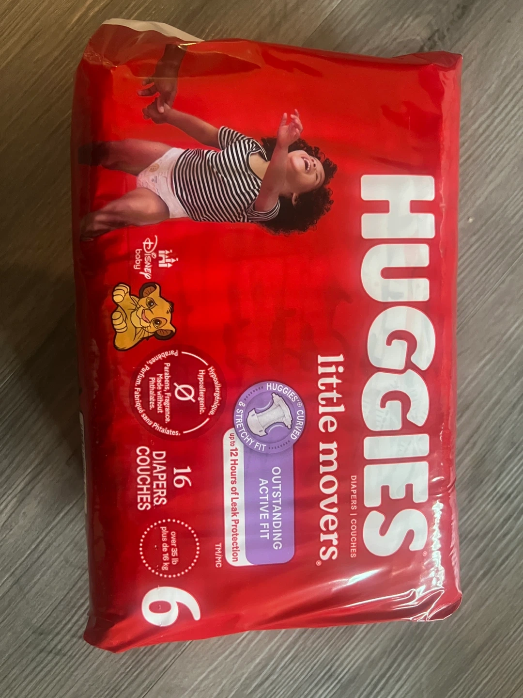 Huggies Little Movers diapers in size 6. This jumbo pack includes 16 diapers, suitable for babies over 35 lbs. They offer outstanding active fit and 12 hours of leak protection. Hypoallergenic and free of parabens and fragrances. I have total count of 256.
