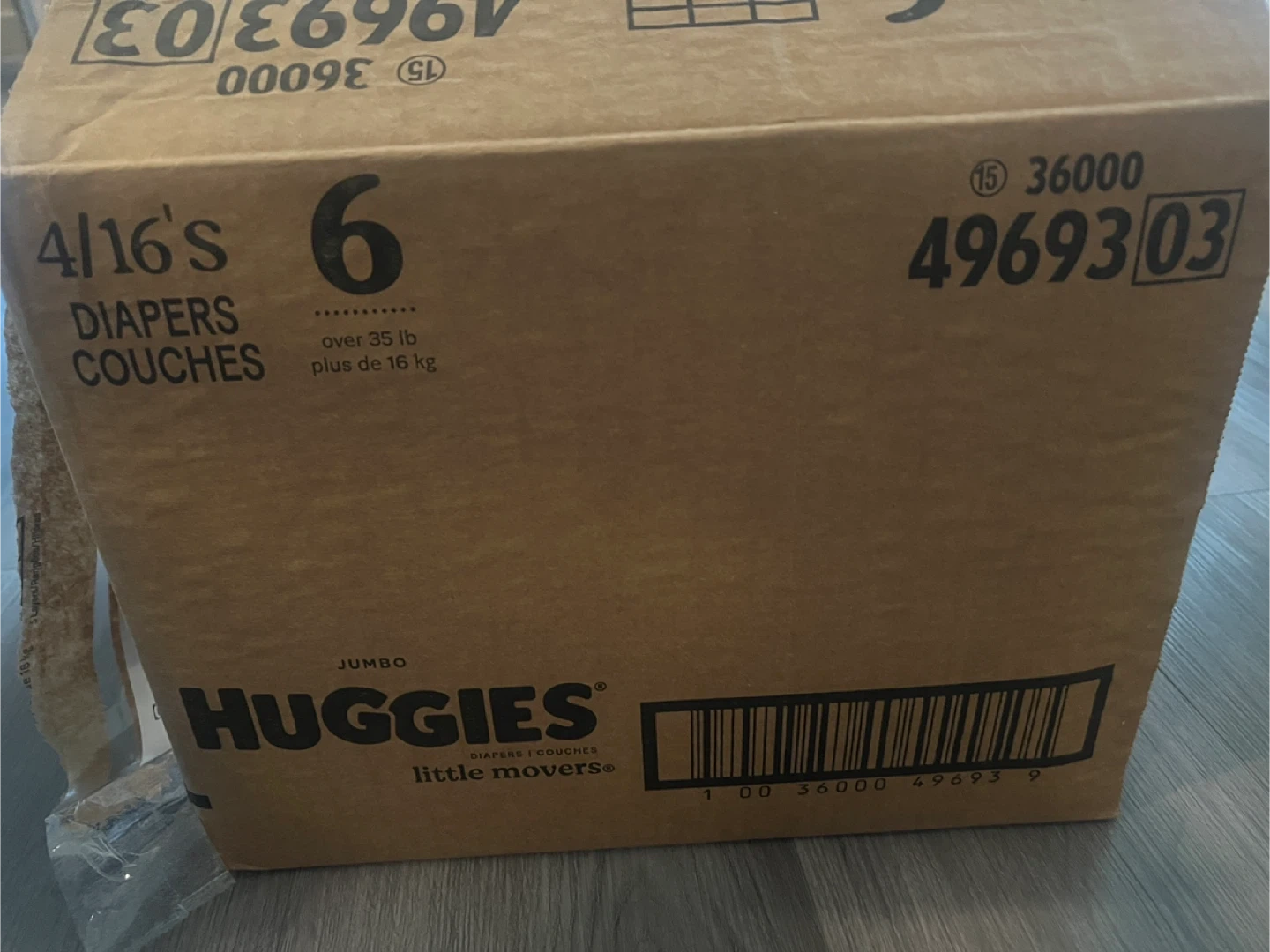 Huggies Little Movers diapers in size 6. This jumbo pack includes 16 diapers, suitable for babies over 35 lbs. They offer outstanding active fit and 12 hours of leak protection. Hypoallergenic and free of parabens and fragrances. I have total count of 256.