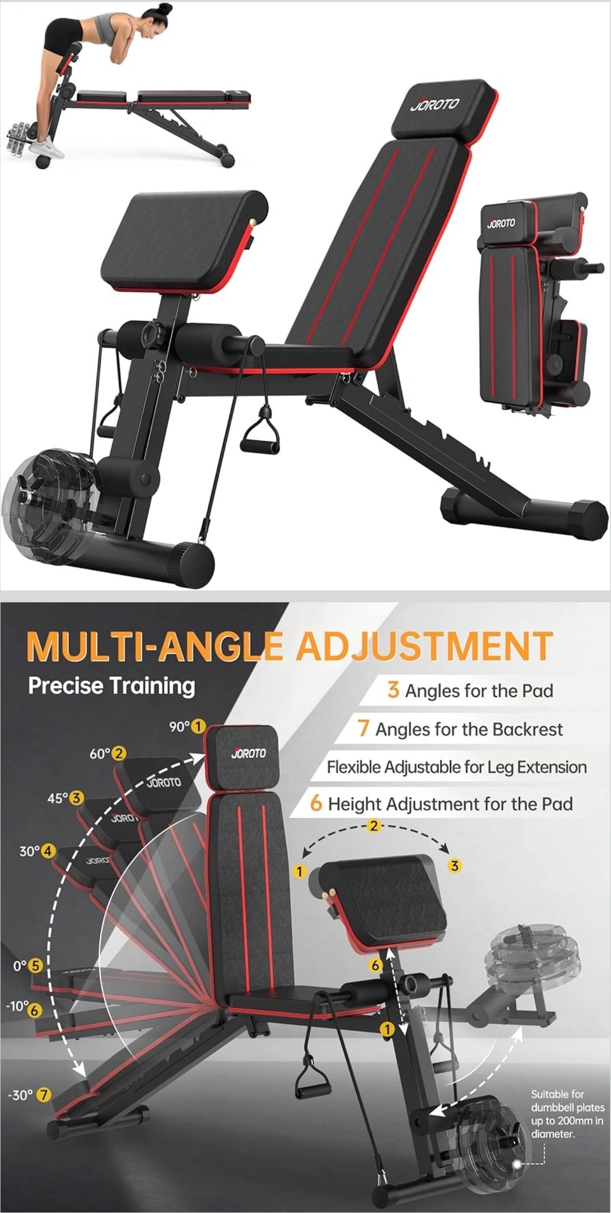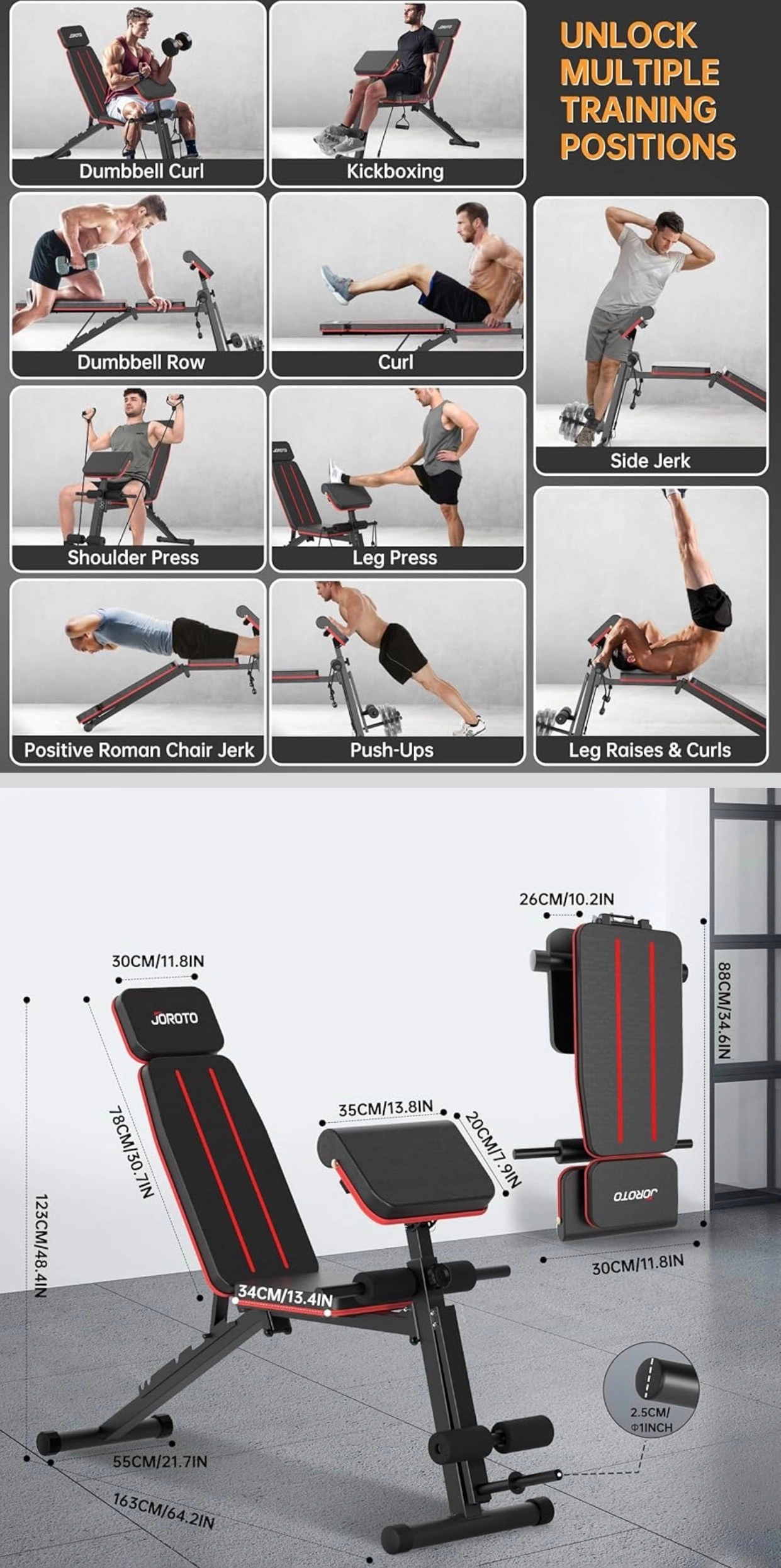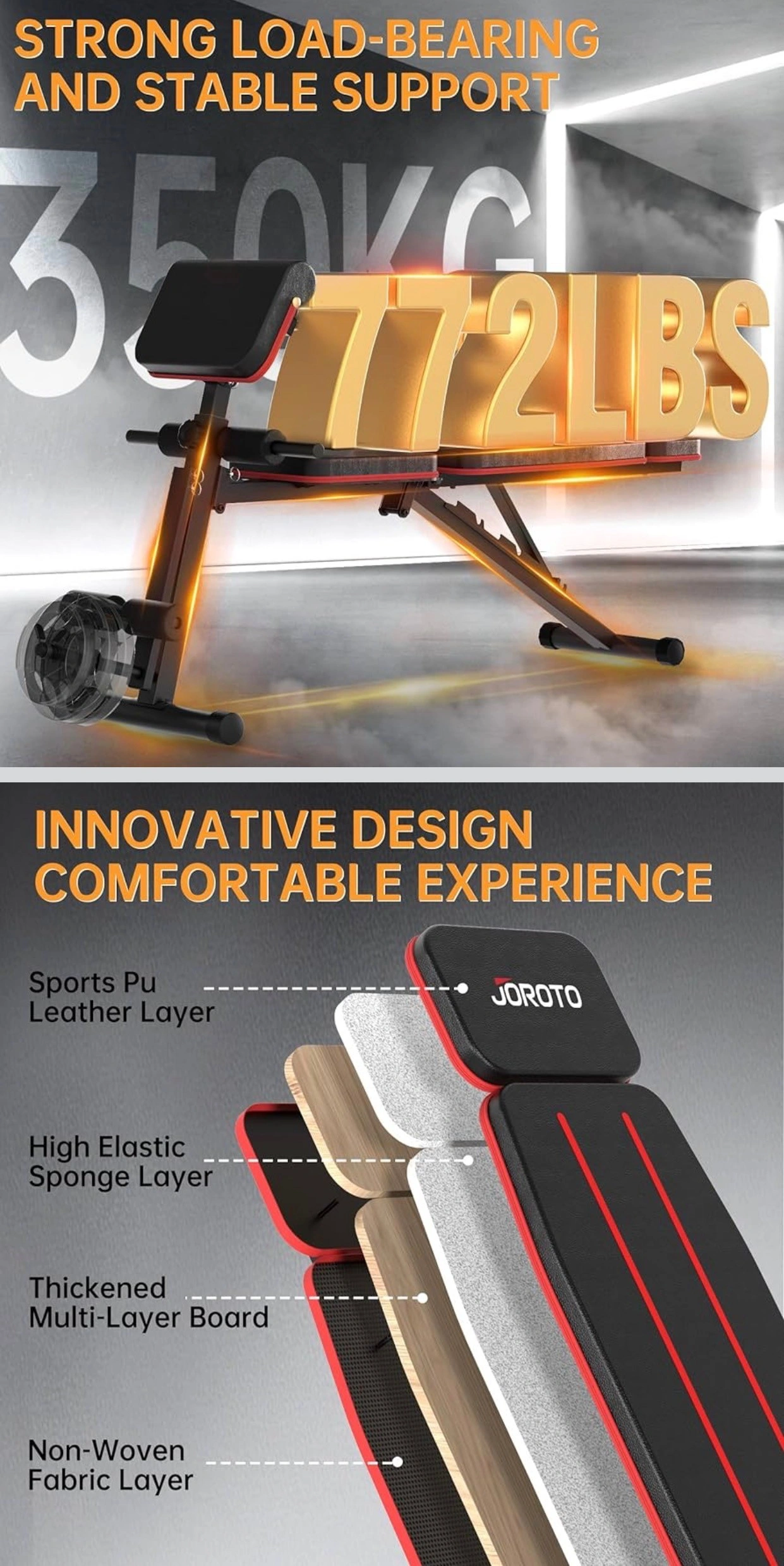 【Heavy-Duty Stable Frame】JOROTO MD55 workout bench is built with thickened high-grade steel, a reinforced triangular support structure, widened front stabilizers, and non-slip rubber feet, delivering reliable stability during bench press and strength training. A heavy-duty support pole with a dual-slot design ensures secure positioning during workouts. Professionally tested to support up to 772 lbs(350kg) total weight capacity, this weight bench is designed for confident, high-intensity training.