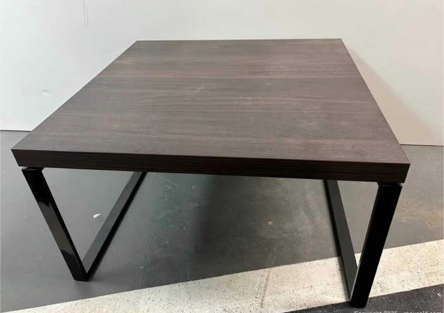 A stylish square coffee table featuring a dark wood top with a subtle grain pattern. Its modern design is complemented by a sleek black metal frame. This piece is perfect for adding a contemporary touch to your living room.
