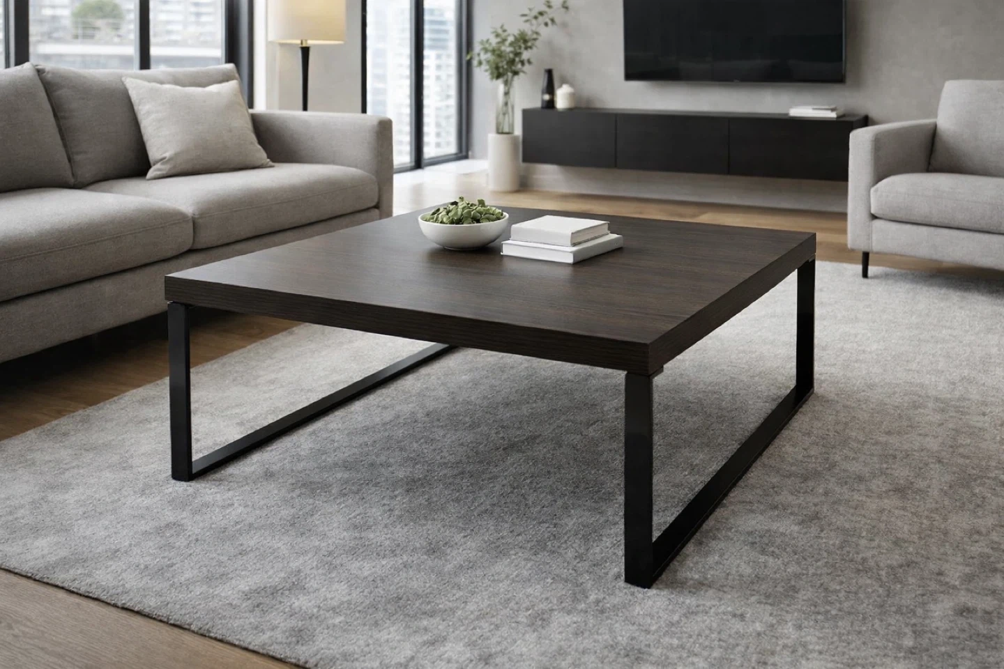 A stylish square coffee table featuring a dark wood top with a subtle grain pattern. Its modern design is complemented by a sleek black metal frame. This piece is perfect for adding a contemporary touch to your living room.