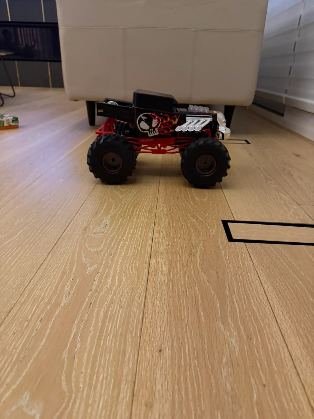 This is a Hot Wheels monster truck with a black, red, and yellow flame design. It has large, durable tires perfect for rough play. It's a cool toy for kids who love trucks!