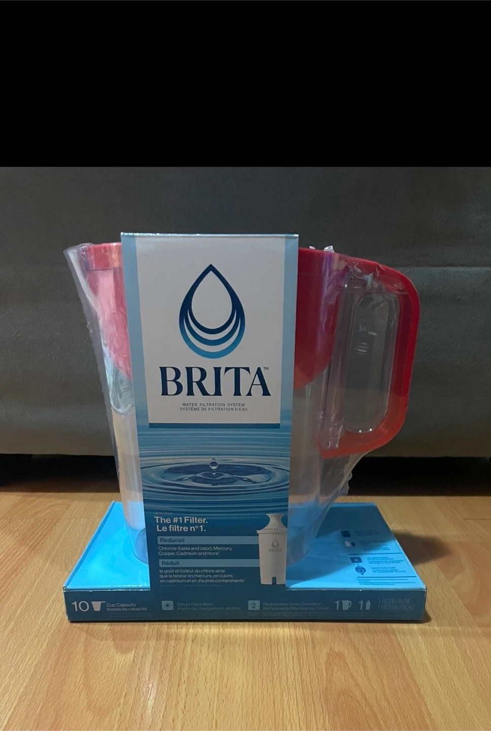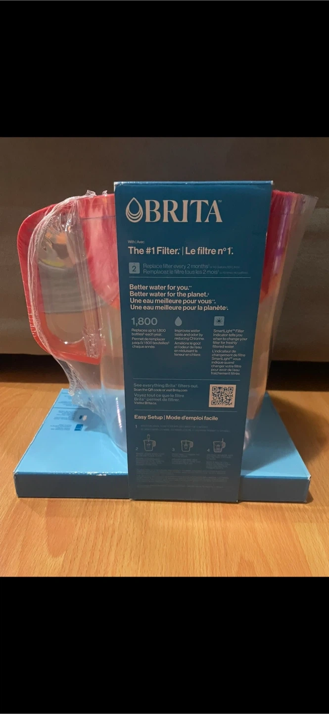 Brita water filtration pitcher with a red handle. Comes with one filter and has a 10-cup capacity. It's designed to reduce contaminants like mercury, copper, cadmium, and more. Replace filter every 2 months for best results!