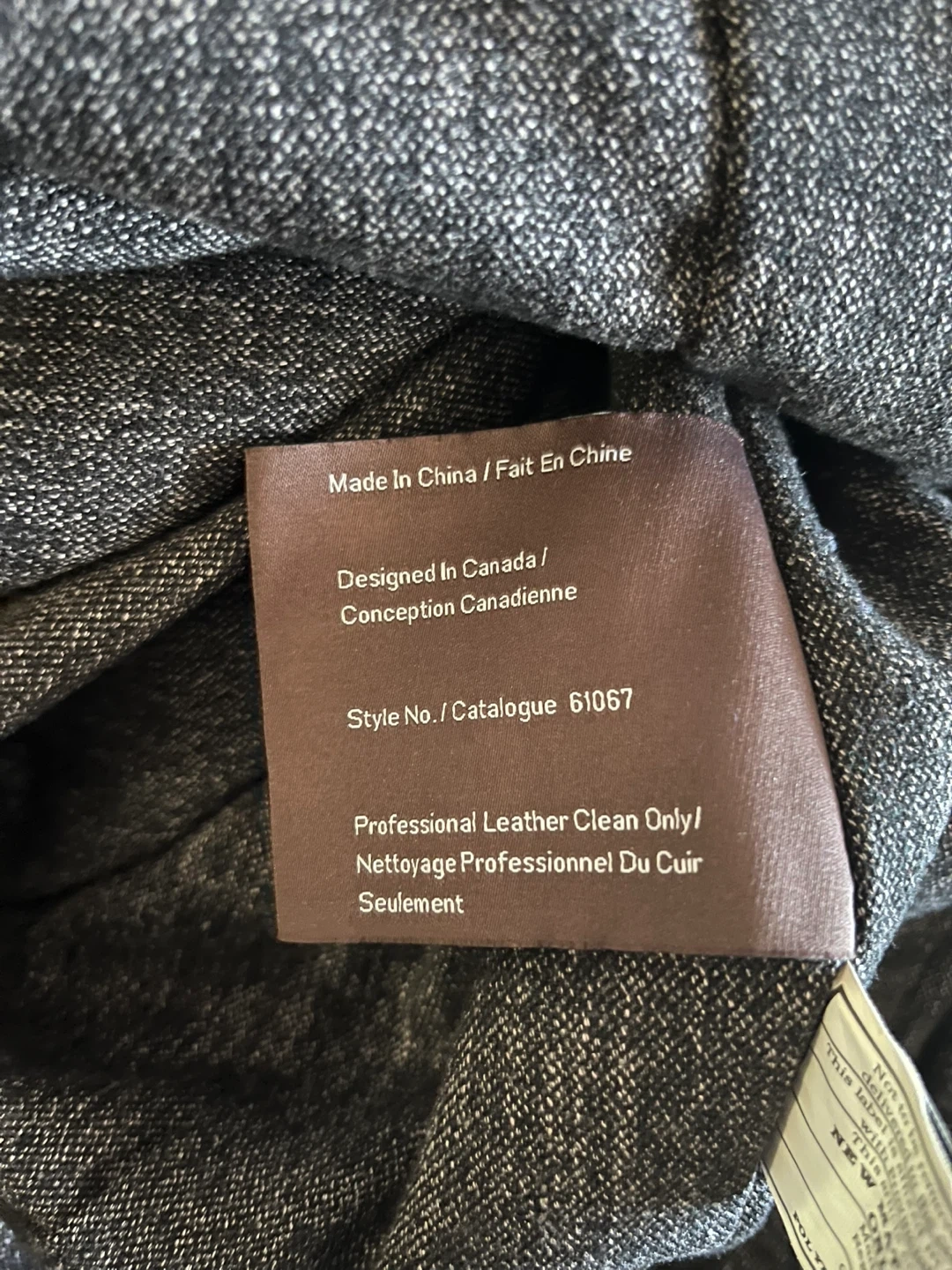 •detailed stitching on body, two-button closure at cowl neck, knit cuffs at end of sleeves, gunmetal zipper closures