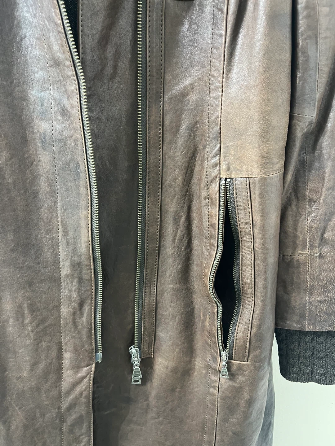 •detailed stitching on body, two-button closure at cowl neck, knit cuffs at end of sleeves, gunmetal zipper closures