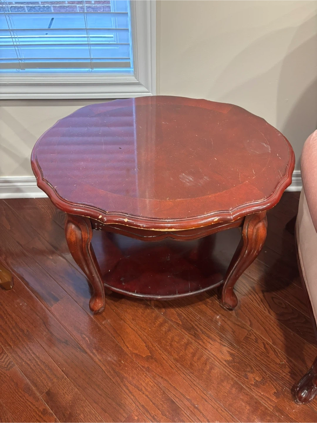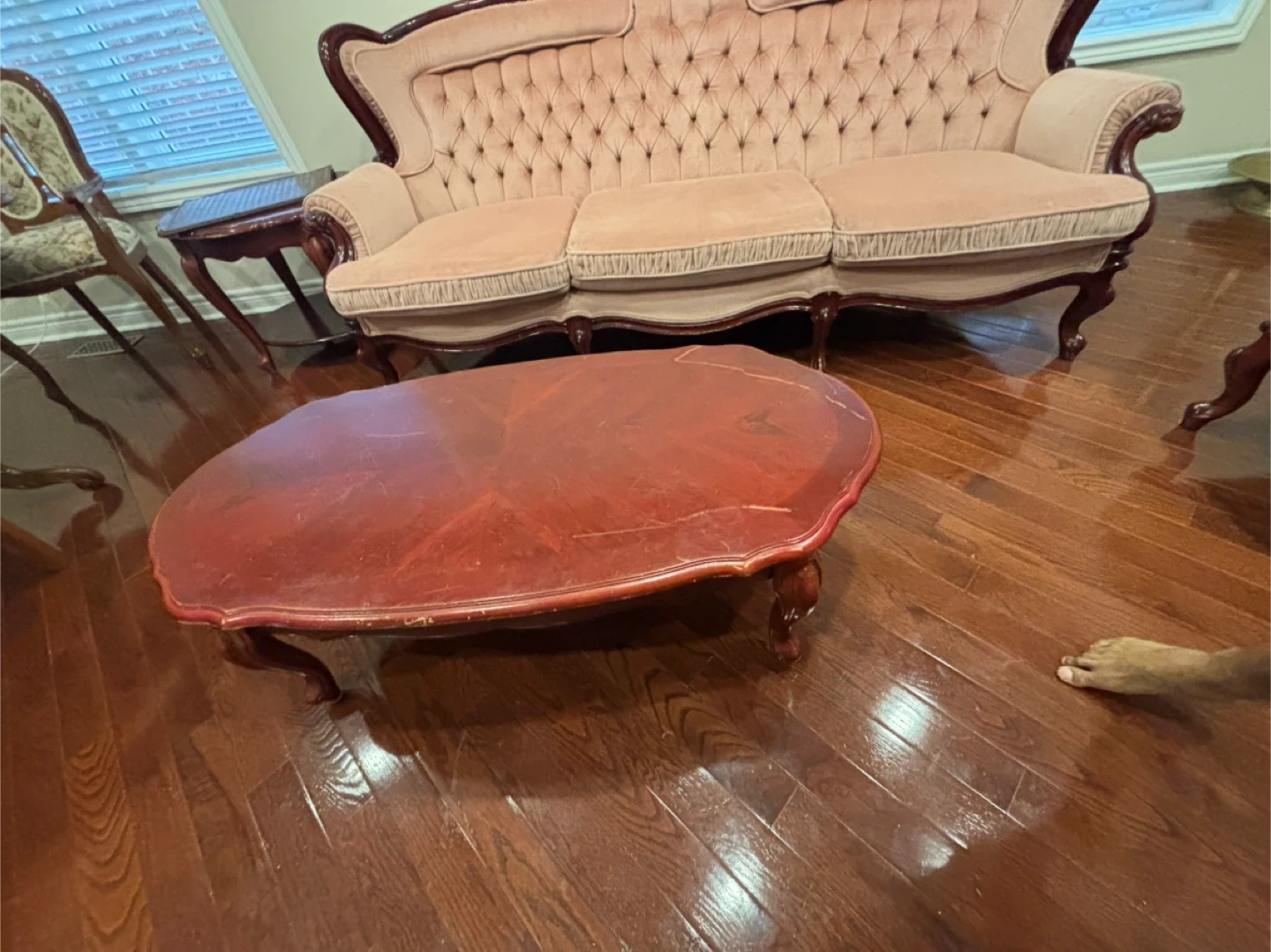 Beautiful wooden dining set including an oval table with six upholstered chairs. It also comes with a glass-door curio cabinet for display. This set would be a lovely addition to your dining room or living space!