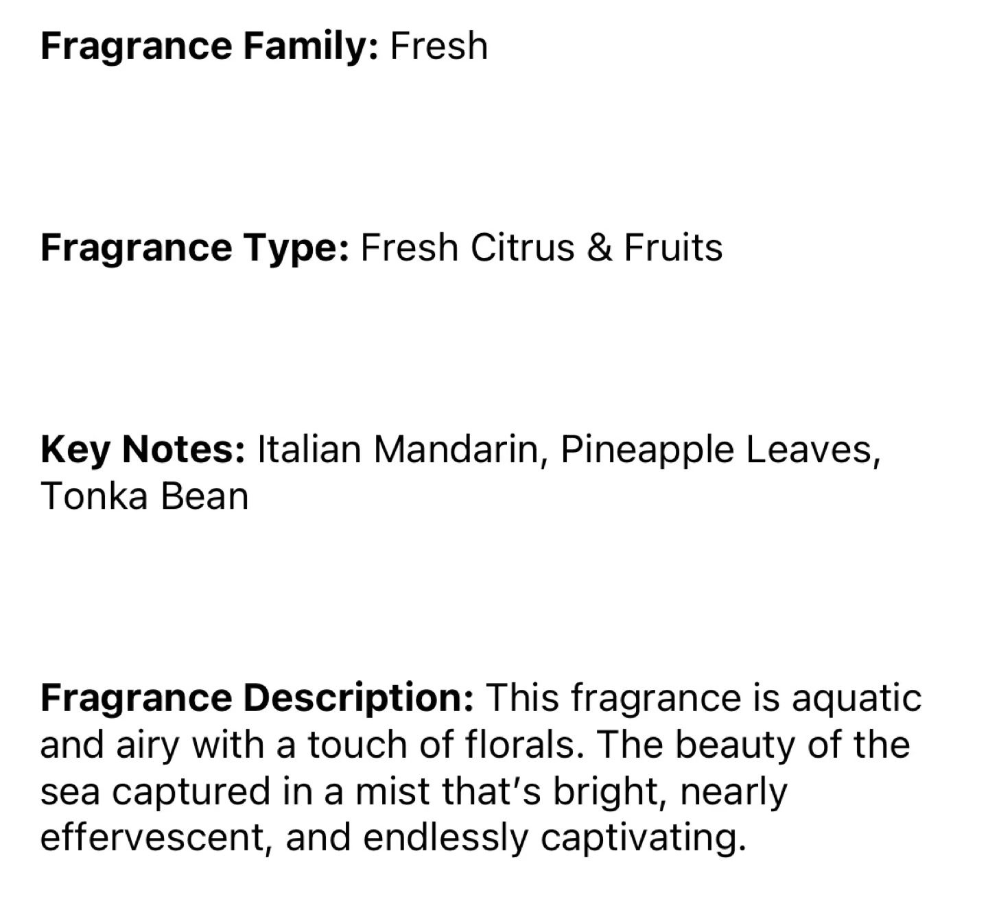 Key notes include Italian Mandarin, Pineapple Leaves, and Tonka Bean
