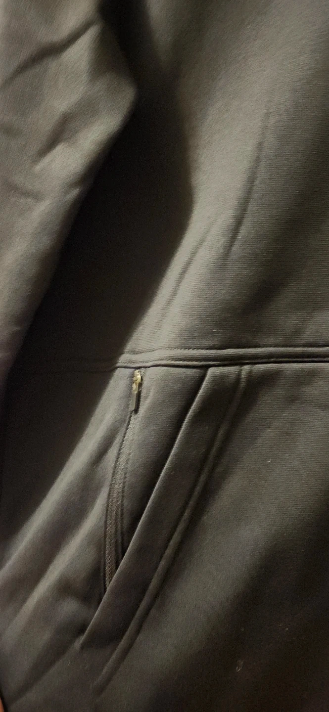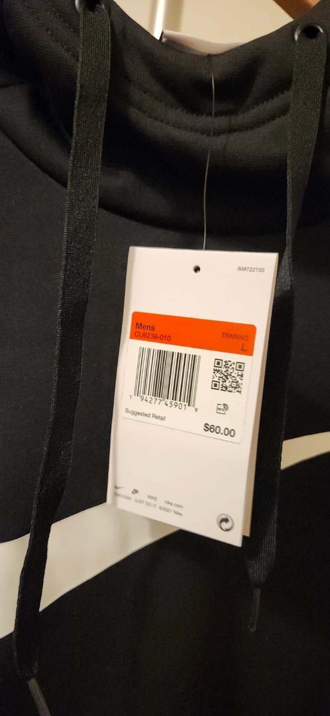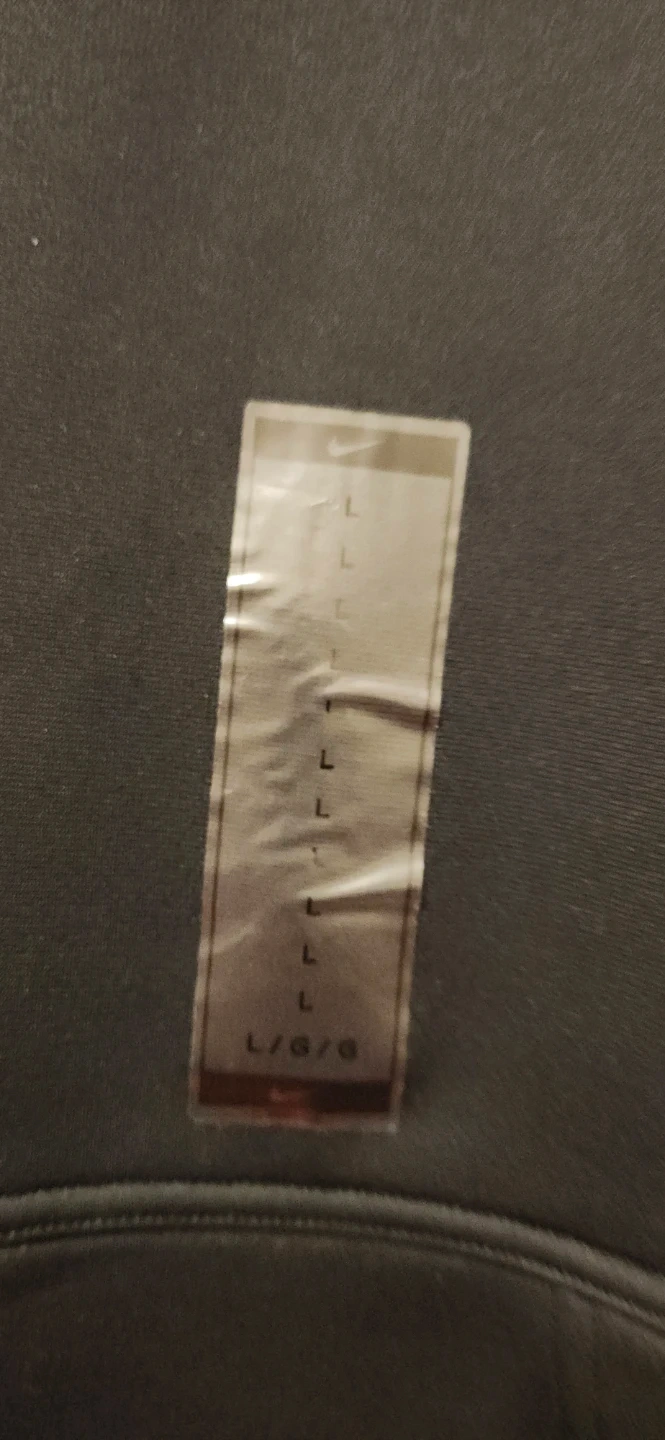 This is a black Nike men's hoodie. It's a size large. It has a front kangaroo pocket with a zippered side.