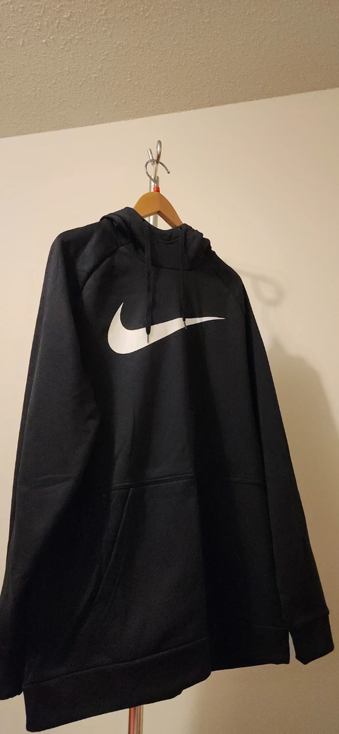 This is a black Nike men's hoodie. It's a size large. It has a front kangaroo pocket with a zippered side.