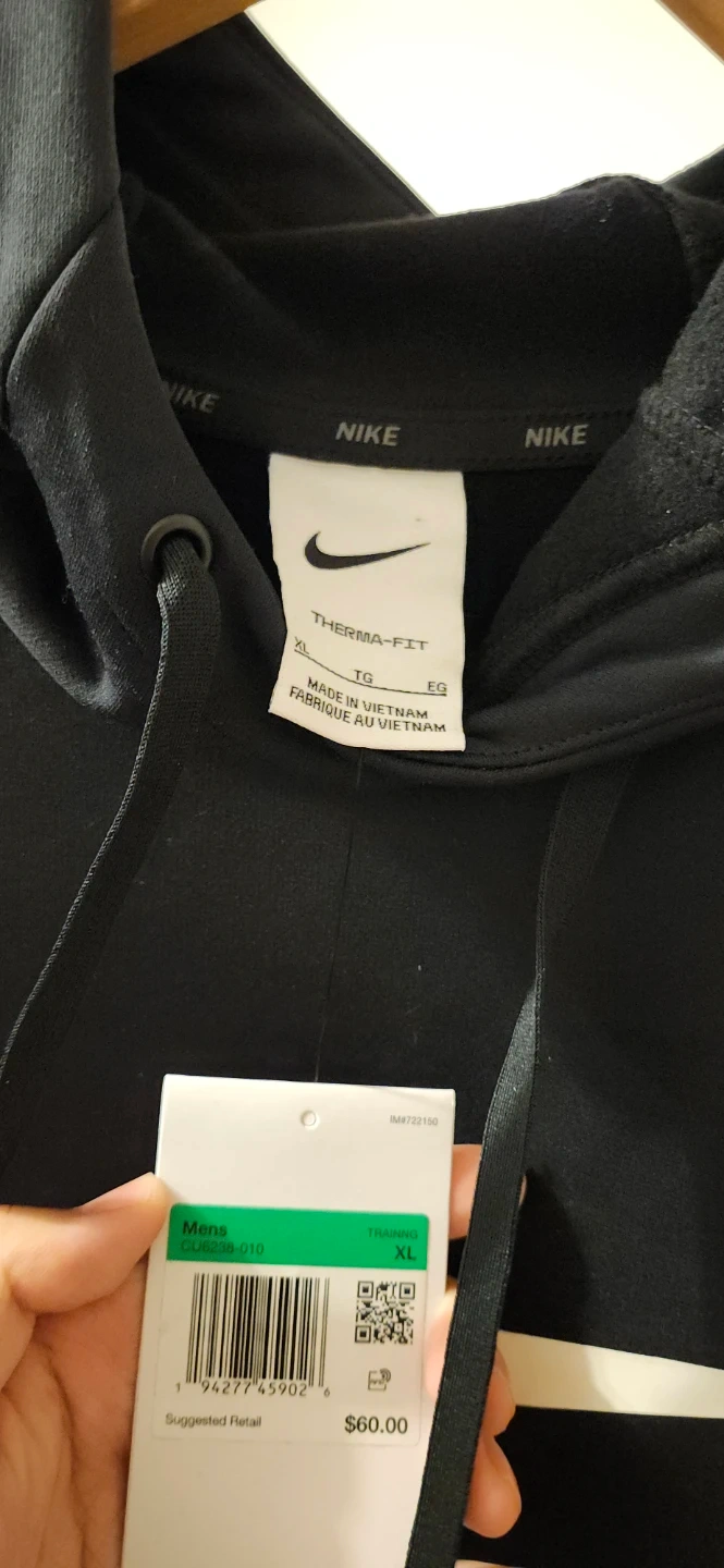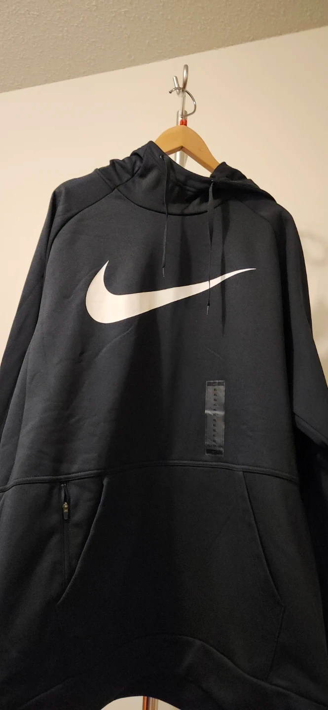 This is a Nike Therma-FIT hoodie in black. It's a men's size XL. Features a zippered pocket and a kangaroo pocket.