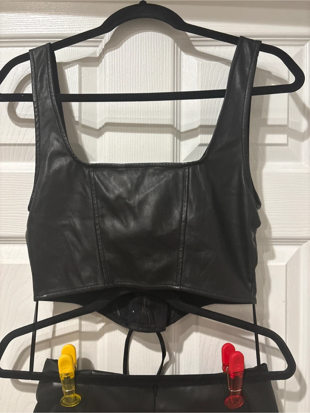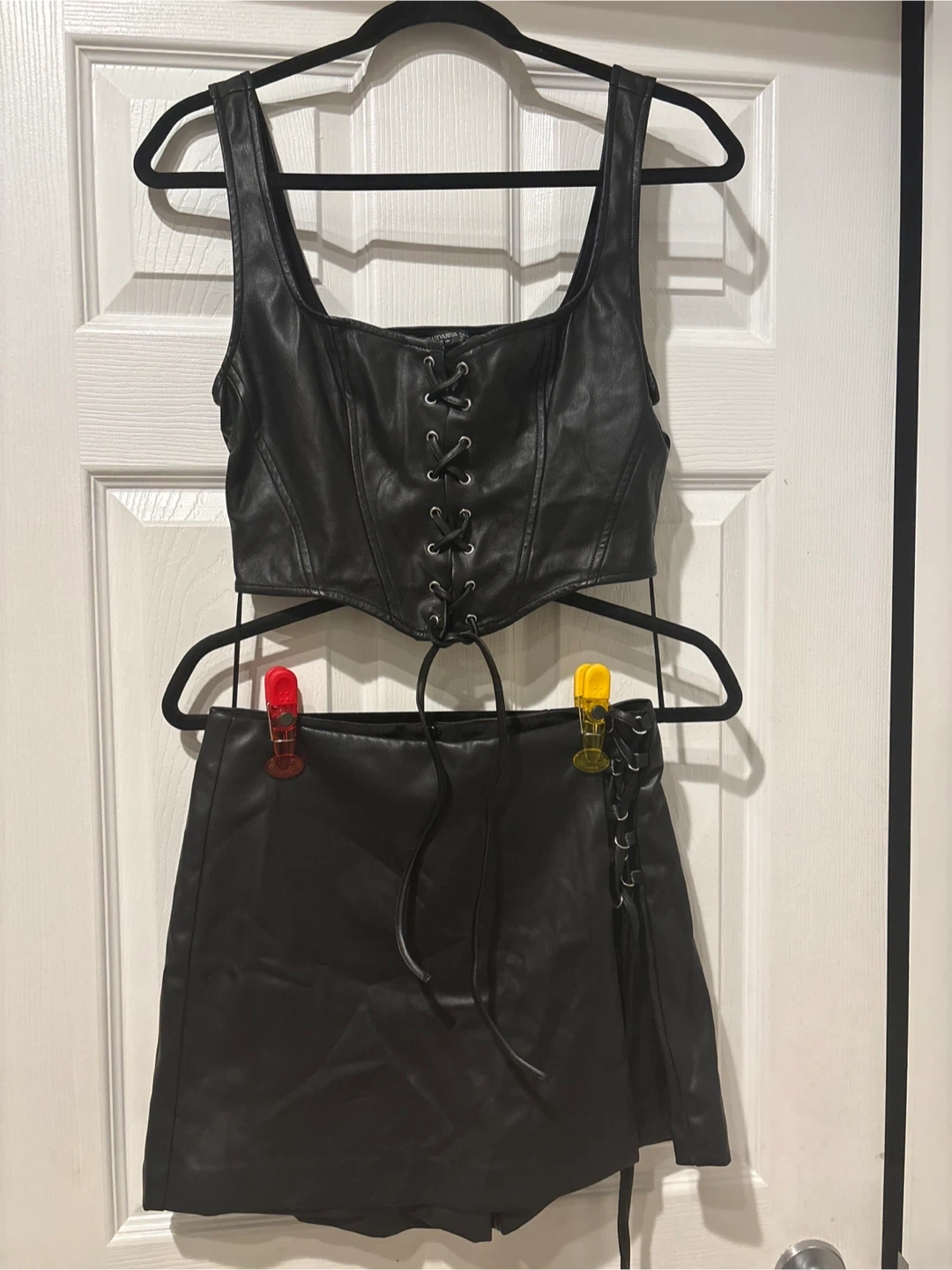 New set with out tag Two-piece faux leather set featuring a lace-up corset top and a lace-up detail short skirt. Black colour. Great for a night out! Super elegant for any occasions size S get ready for party time pick up walnut grove Langley