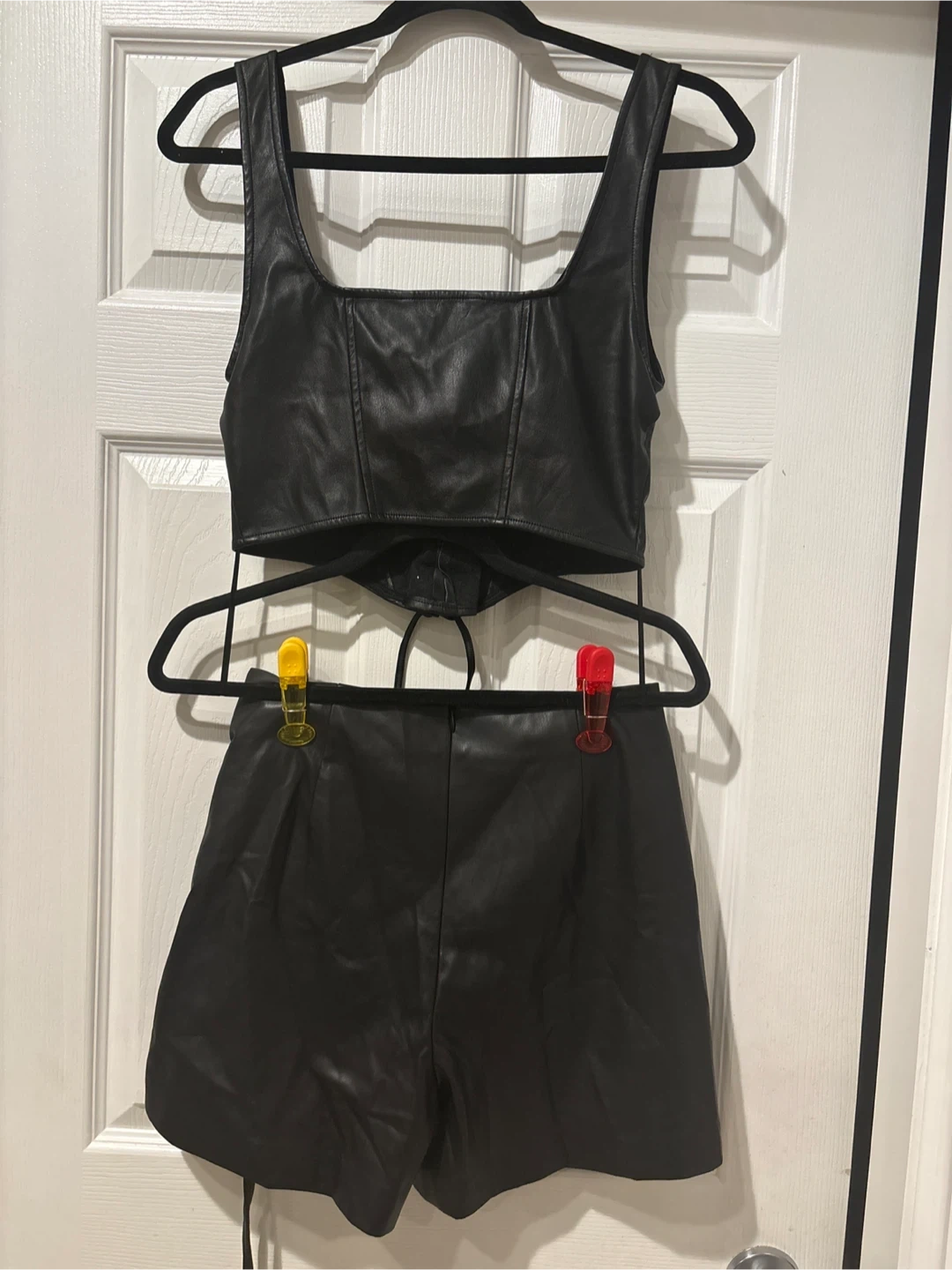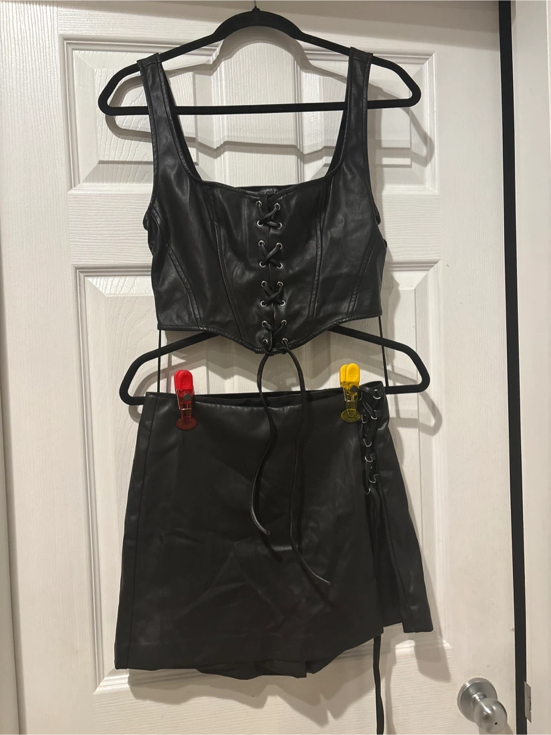 New set with out tag Two-piece faux leather set featuring a lace-up corset top and a lace-up detail short skirt. Black colour. Great for a night out! Super elegant for any occasions size S get ready for party time pick up walnut grove Langley
